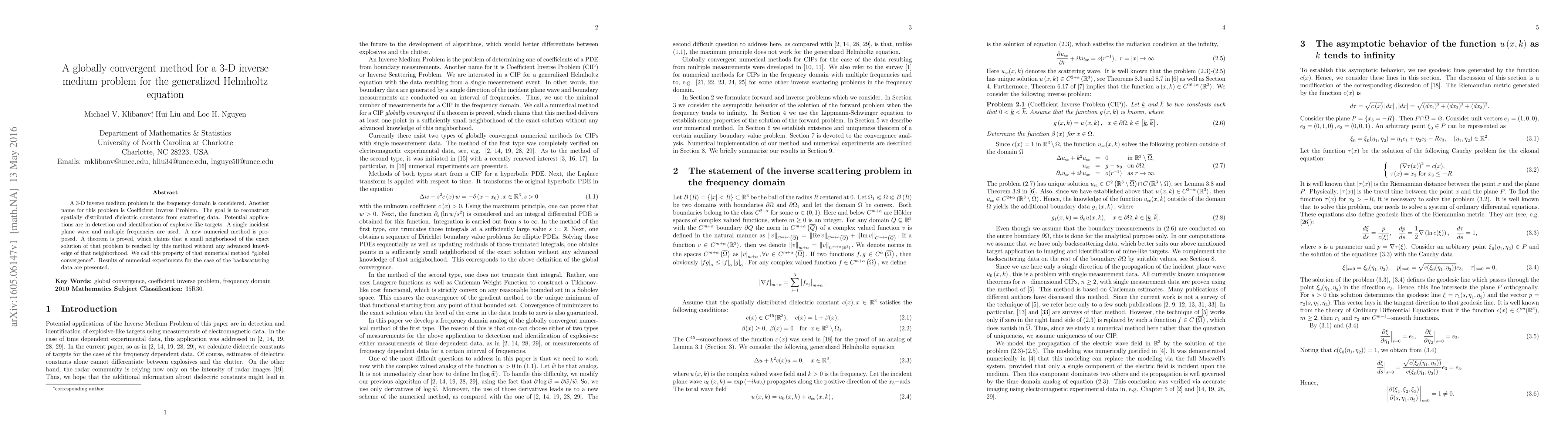 A 3-D inverse medium problem in the frequency domain is considered. Another name for this problem is Coefficient Inverse Problem. The goal is to reconstruct spatially distributed dielectric constants from scattering data. Potential applications are in detection and identification of explosive-like targets. A single incident plane wave and multiple frequencies are used. A new numerical method is proposed. A theorem is proved, which claims that a small neigborhood of the exact solution of that problem is reached by this method without any advanced knowledge of that neighborhood. We call this property of that numerical method "global convergence". Results of numerical experiments for the case of the backscattering data are presented.