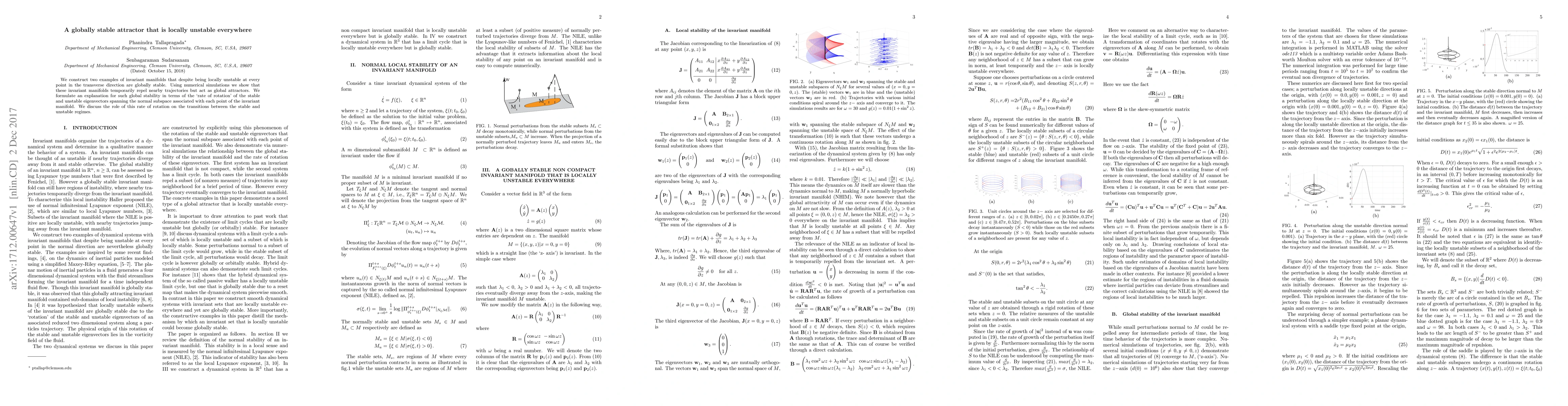 The paper presents two examples of invariant manifolds that, despite being locally unstable at every point, are globally stable. Numerical simulations demonstrate these manifolds temporarily repel nearby trajectories but act as global attractors. The global stability is explained through the 'rate of rotation' of stable and unstable eigenvectors. The study discusses the impact of this rate on transitions between stable and unstable regimes.
