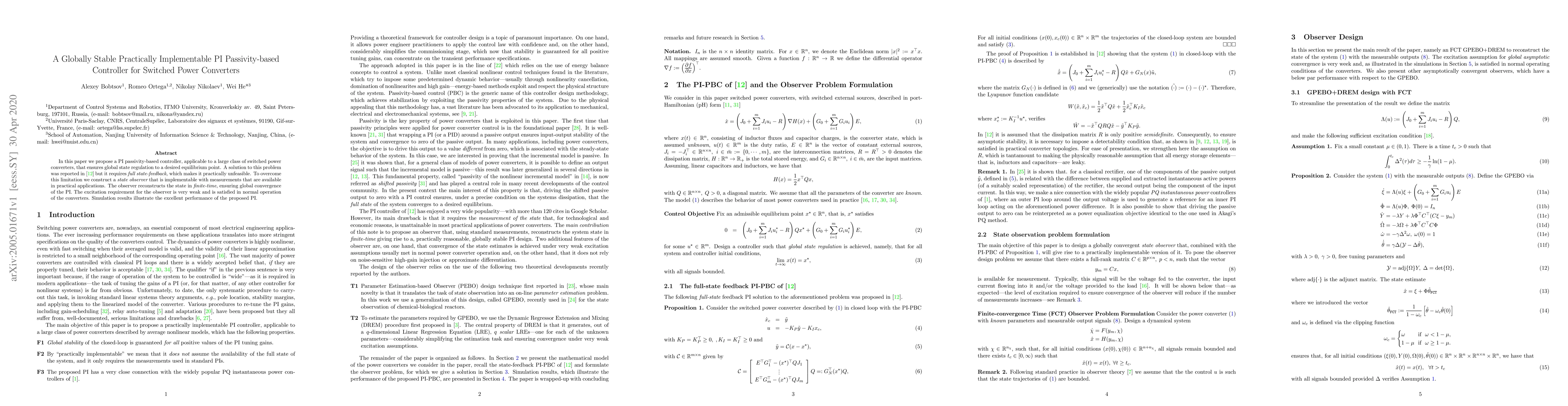 In this paper we propose a PI passivity-based controller, applicable to a large class of switched power converters, that ensures global state regulation to a desired equilibrium point. A solution to this problem was reported in \cite{HERetal} but it requires full state-feedback, which makes it practically unfeasible. To overcome this limitation we construct a state observer that is implementable with measurements that are available in practical applications. The observer reconstructs the state in finite-time, ensuring global convergence of the PI. The excitation requirement for the observer is very weak and is satisfied in normal operation of the converters. Simulation results illustrate the excellent performance of the proposed PI.