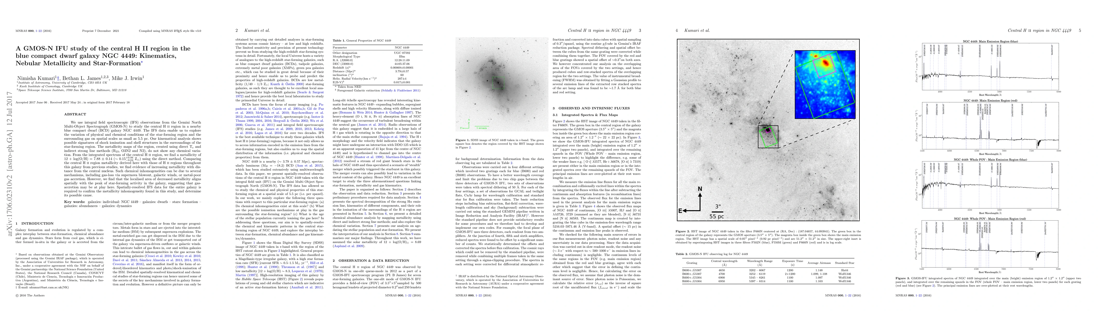 This study uses GMOS-N IFS observations to analyze the central H II region in NGC 4449, revealing shock ionization and shell structures, and finds consistent metallicity without chemical variation. Evidence suggests increasing metallicity with distance from the center, potentially due to gas-loss or accretion, with the latter aligning with peak star-forming activity.