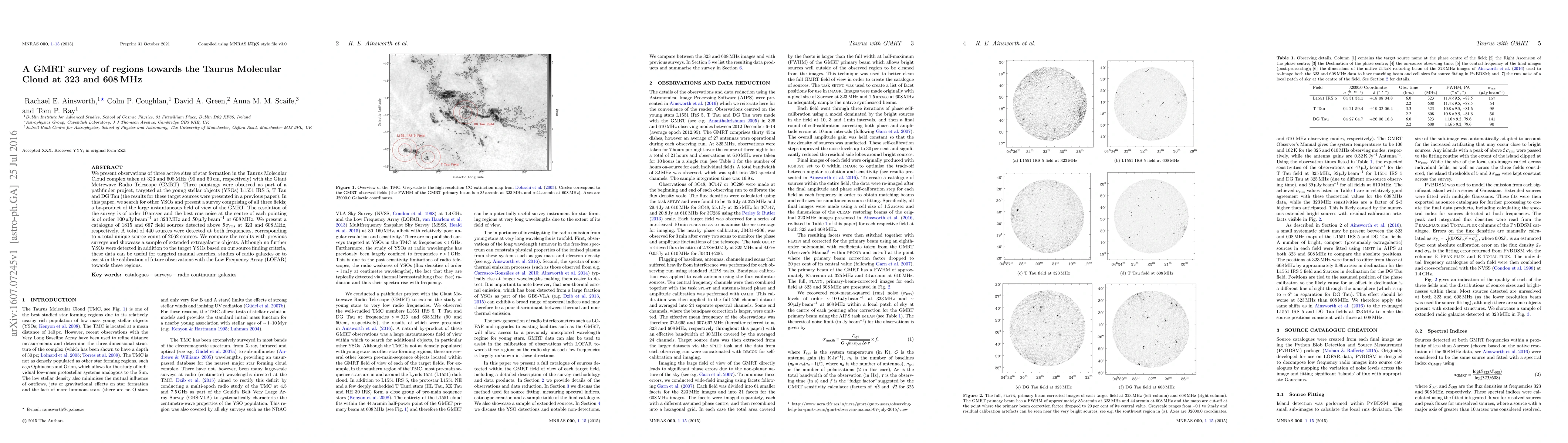 We present observations of three active sites of star formation in the Taurus Molecular Cloud complex taken at 323 and 608 MHz (90 and 50 cm, respectively) with the Giant Metrewave Radio Telescope (GMRT). Three pointings were observed as part of a pathfinder project, targeted at the young stellar objects (YSOs) L1551 IRS 5, T Tau and DG Tau (the results for these target sources were presented in a previous paper). In this paper, we search for other YSOs and present a survey comprising of all three fields; a by-product of the large instantaneous field of view of the GMRT. The resolution of the survey is of order 10 arcsec and the best rms noise at the centre of each pointing is of order $100\,\mu$Jy beam$^{-1}$ at 323 MHz and $50\,\mu$Jy beam$^{-1}$ at 608 MHz. We present a catalogue of 1815 and 687 field sources detected above $5\,\sigma_{\rm rms}$ at 323 and 608 MHz, respectively. A total of 440 sources were detected at both frequencies, corresponding to a total unique source count of 2062 sources. We compare the results with previous surveys and showcase a sample of extended extragalactic objects. Although no further YSOs were detected in addition to the target YSOs based on our source finding criteria, these data can be useful for targeted manual searches, studies of radio galaxies or to assist in the calibration of future observations with the Low Frequency Array (LOFAR) towards these regions.
