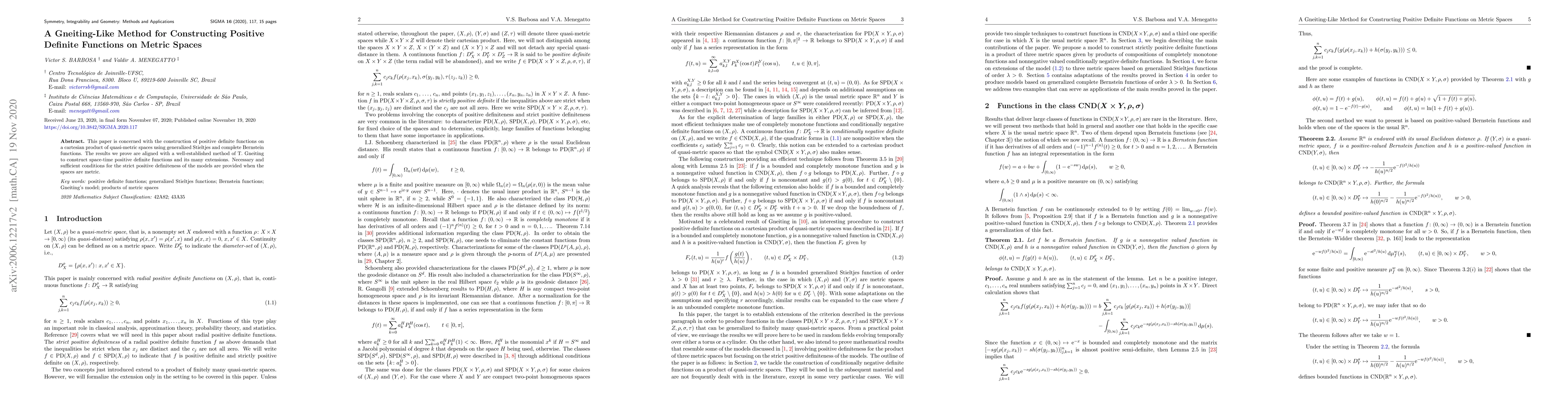 This paper develops a method akin to Gneiting's for constructing positive definite functions on metric spaces via generalized Stieltjes and complete Bernstein functions, providing necessary and sufficient conditions for strict positive definiteness. The approach extends established techniques for space-time positive definite functions.