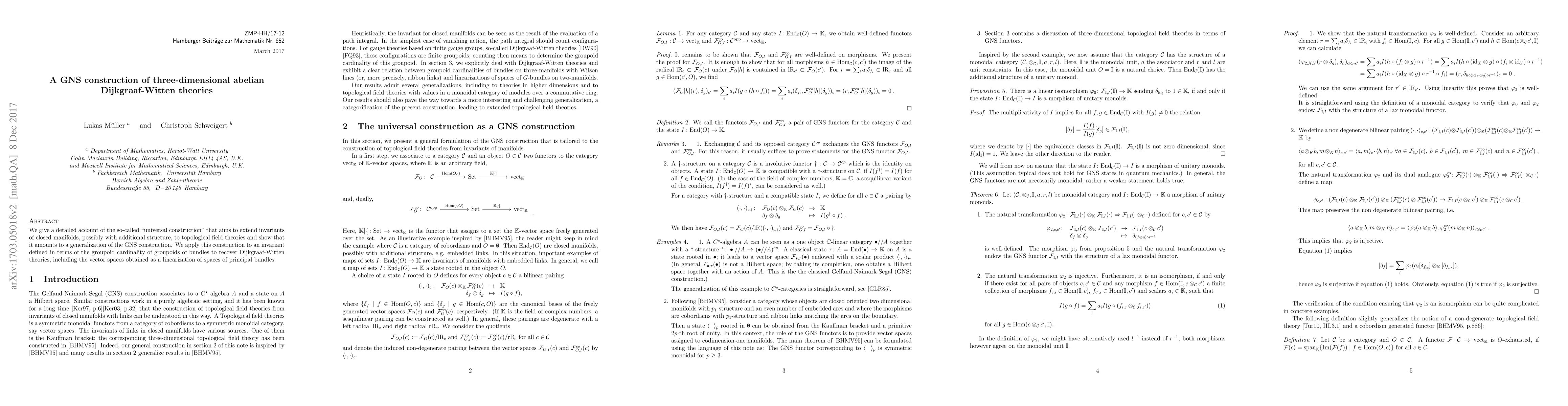 We give a detailed account of the so-called "universal construction" that aims to extend invariants of closed manifolds, possibly with additional structure, to topological field theories and show that it amounts to a generalization of the GNS construction. We apply this construction to an invariant defined in terms of the groupoid cardinality of groupoids of bundles to recover Dijkgraaf-Witten theories, including the vector spaces obtained as a linearization of spaces of principal bundles.