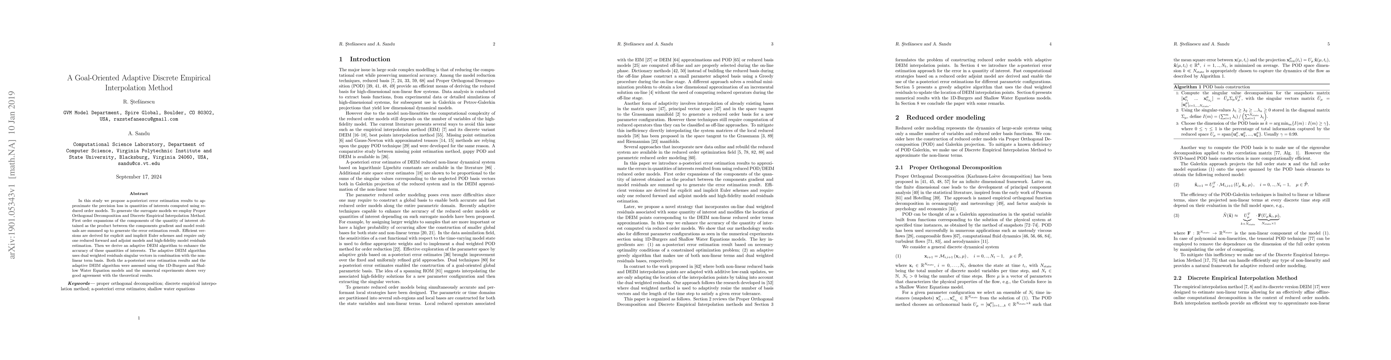In this study we propose a-posteriori error estimation results to approximate the precision loss in quantities of interests computed using reduced order models. To generate the surrogate models we employ Proper Orthogonal Decomposition and Discrete Empirical Interpolation Method. First order expansions of the components of the quantity of interest obtained as the product between the components gradient and model residuals are summed up to generate the error estimation result. Efficient versions are derived for explicit and implicit Euler schemes and require only one reduced forward and adjoint models and high-fidelity model residuals estimation. Then we derive an adaptive DEIM algorithm to enhance the accuracy of these quantities of interests. The adaptive DEIM algorithm uses dual weighted residuals singular vectors in combination with the non-linear term basis. Both the a-posteriori error estimation results and the adaptive DEIM algorithm were assessed using the 1D-Burgers and Shallow Water Equation models and the numerical experiments shows very good agreement with the theoretical results.