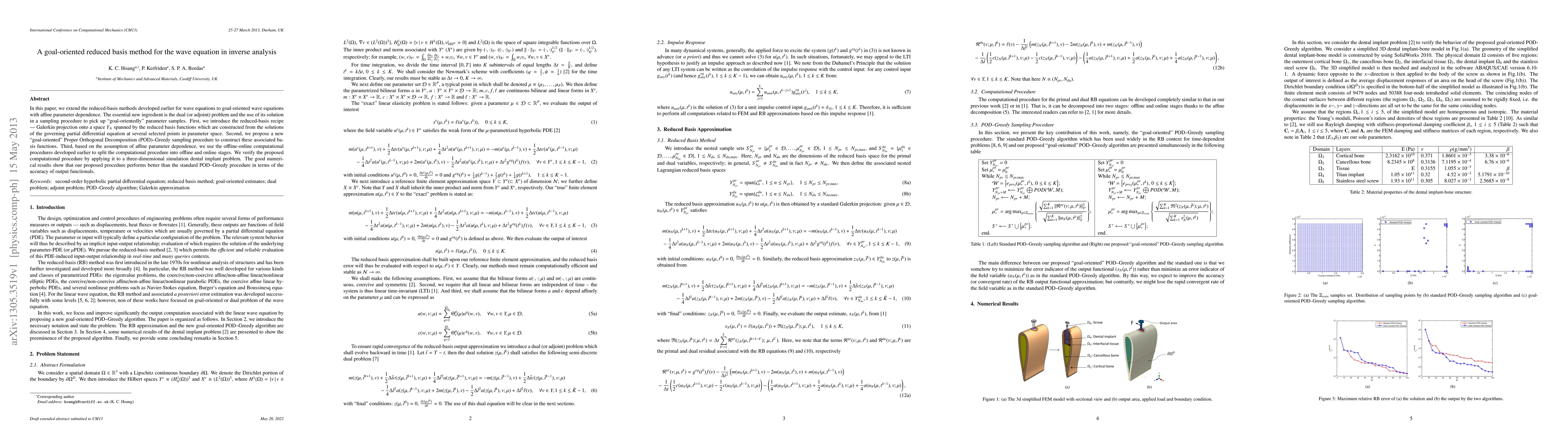 In this paper, we extend the reduced-basis methods developed earlier for wave equations to goal-oriented wave equations with affine parameter dependence. The essential new ingredient is the dual (or adjoint) problem and the use of its solution in a sampling procedure to pick up "goal-orientedly" parameter samples. First, we introduce the reduced-basis recipe --- Galerkin projection onto a space $Y_N$ spanned by the reduced basis functions which are constructed from the solutions of the governing partial differential equation at several selected points in parameter space. Second, we propose a new "goal-oriented" Proper Orthogonal Decomposition (POD)--Greedy sampling procedure to construct these associated basis functions. Third, based on the assumption of affine parameter dependence, we use the offline-online computational procedures developed earlier to split the computational procedure into offline and online stages. We verify the proposed computational procedure by applying it to a three-dimensional simulation dental implant problem. The good numerical results show that our proposed procedure performs better than the standard POD--Greedy procedure in terms of the accuracy of output functionals.