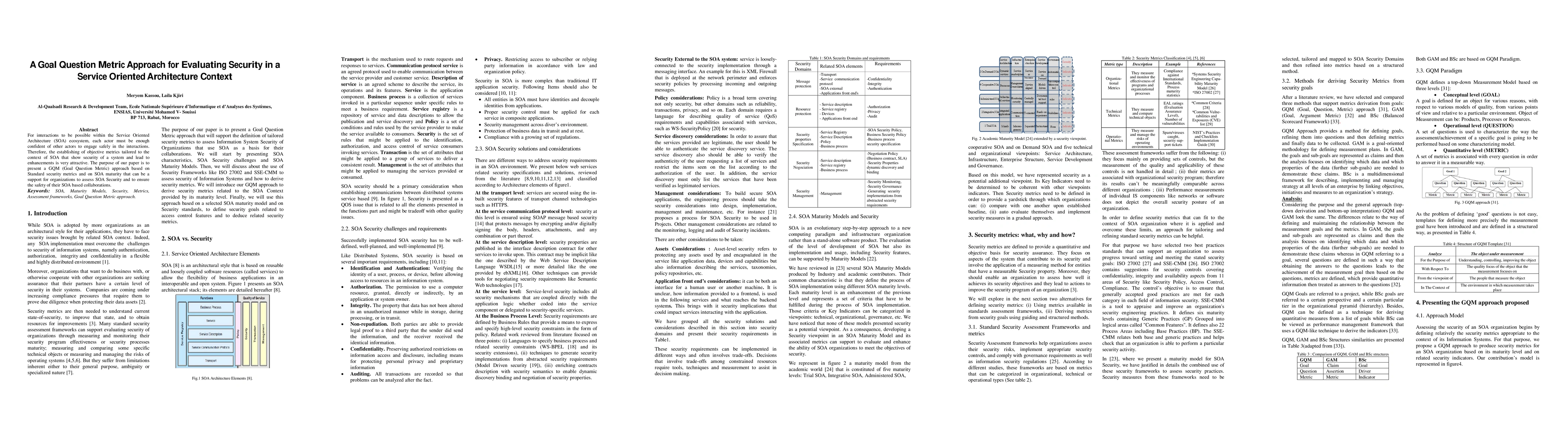 This paper proposes a Goal Question Metric (GQM) approach to evaluate security within a Service Oriented Architecture (SOA) context. It aims to provide objective metrics based on standard security metrics and SOA maturity to help organizations assess SOA security and ensure safe collaborations.