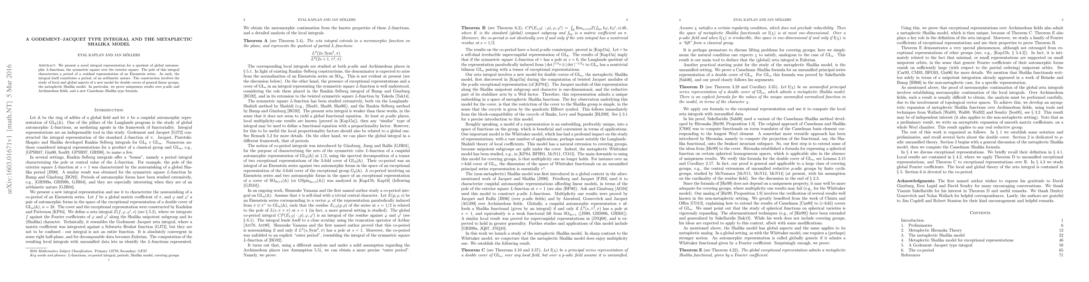 We present a novel integral representation for a quotient of global automorphic L-functions, the symmetric square over the exterior square. The pole of this integral characterizes a period of a residual representation of an Eisenstein series. As such, the integral itself constitutes a period, of an arithmetic nature. The construction involves the study of local and global aspects of a new model for double covers of general linear groups, the metaplectic Shalika model. In particular, we prove uniqueness results over p-adic and Archimedean fields, and a new Casselman-Shalika type formula.