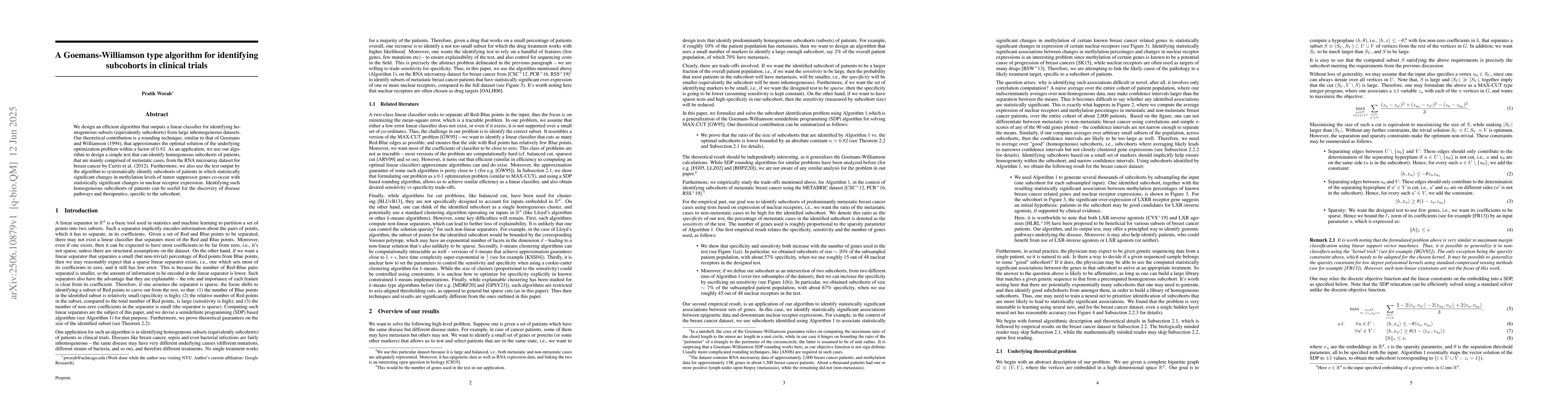We design an efficient algorithm that outputs a linear classifier for identifying homogeneous subsets (equivalently subcohorts) from large inhomogeneous datasets. Our theoretical contribution is a rounding technique, similar to that of Goemans and Williamson (1994), that approximates the optimal solution of the underlying optimization problem within a factor of $0.82$. As an application, we use our algorithm to design a simple test that can identify homogeneous subcohorts of patients, that are mainly comprised of metastatic cases, from the RNA microarray dataset for breast cancer by Curtis et al. (2012). Furthermore, we also use the test output by the algorithm to systematically identify subcohorts of patients in which statistically significant changes in methylation levels of tumor suppressor genes co-occur with statistically significant changes in nuclear receptor expression. Identifying such homogeneous subcohorts of patients can be useful for the discovery of disease pathways and therapeutics, specific to the subcohort.