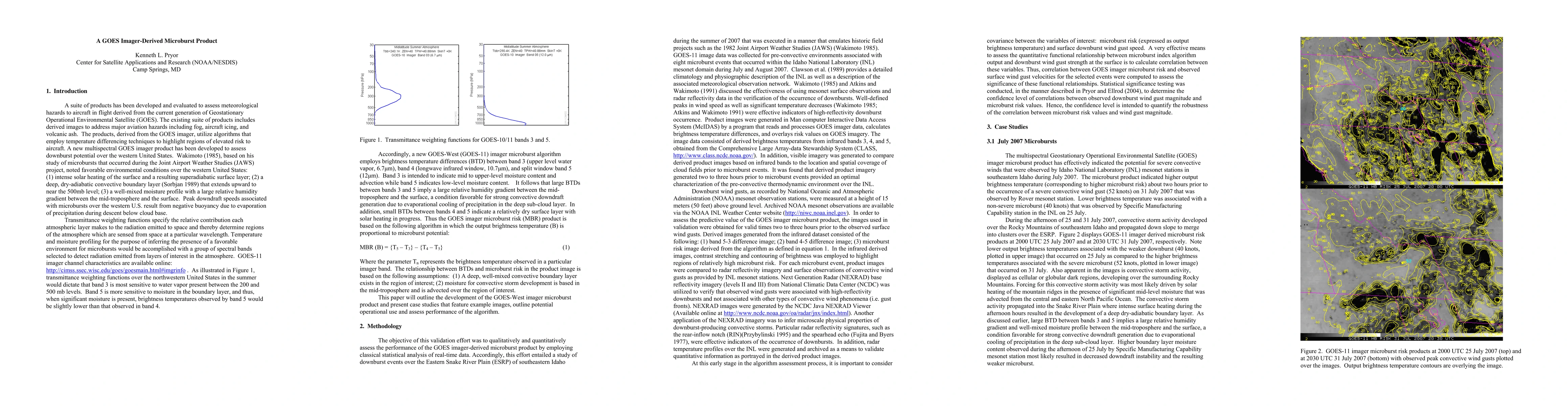 A new multispectral Geostationary Operational Environmental Satellite (GOES) imager product has been developed to assess downburst potential over the western United States employing brightness temperature differences (BTD) between band 3 (upper level water vapor), band 4 (longwave infrared window), and split window band 5. Band 3 is intended to indicate mid to upper-level moisture content and advection while band 5 indicates low-level moisture content. Large BTDs between bands 3 and 5 imply a large relative humidity gradient between the mid-troposphere and the surface, a condition favorable for strong convective downdraft generation due to evaporational cooling of precipitation in the deep sub-cloud layer. In addition, small BTDs between bands 4 and 5 indicate a relatively dry surface layer with solar heating in progress. This paper will outline the development of the GOES-West imager microburst product and present case studies that feature example images, outline potential operational use and assess performance of the algorithm.