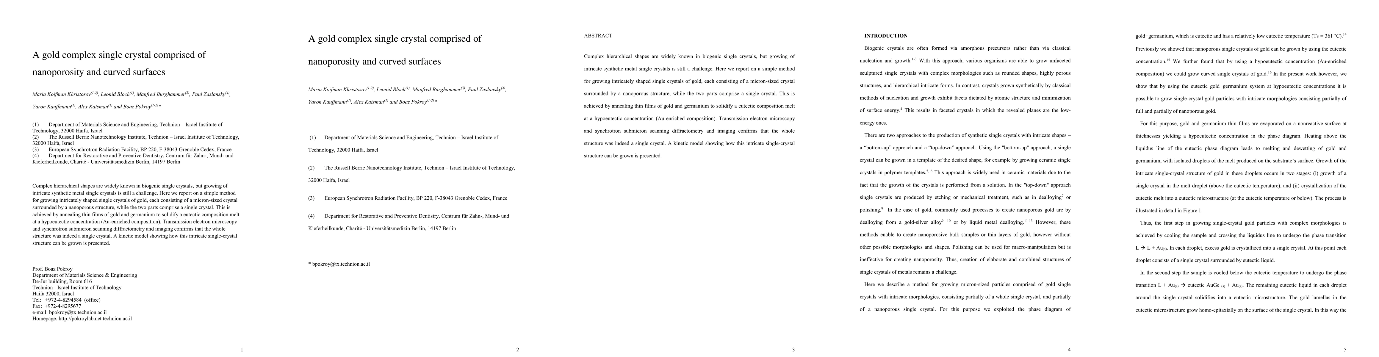 This paper describes a novel method for growing gold single crystals with intricate, nanoporous structures achieved through annealing gold and germanium thin films. The resulting complex shapes are confirmed to be a single crystal using advanced microscopy and diffraction techniques, along with a kinetic model explaining the growth process.