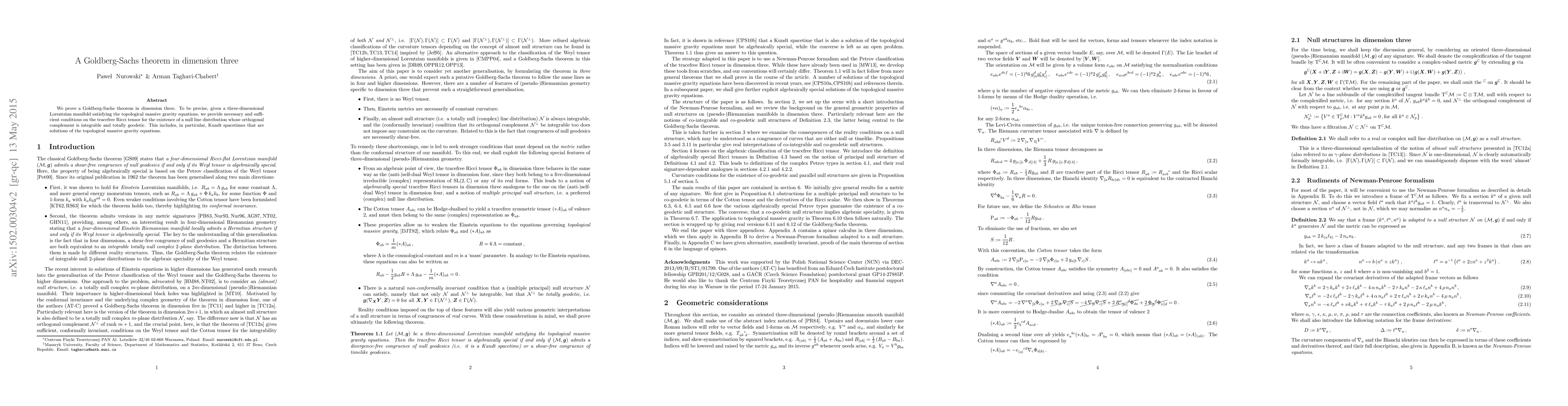 This paper proves a three-dimensional Goldberg-Sachs theorem, establishing necessary and sufficient conditions for the existence of a null line distribution in Lorentzian manifolds satisfying topological massive gravity equations, with the orthogonal complement being integrable and totally geodetic. This includes Kundt spacetimes as special cases.