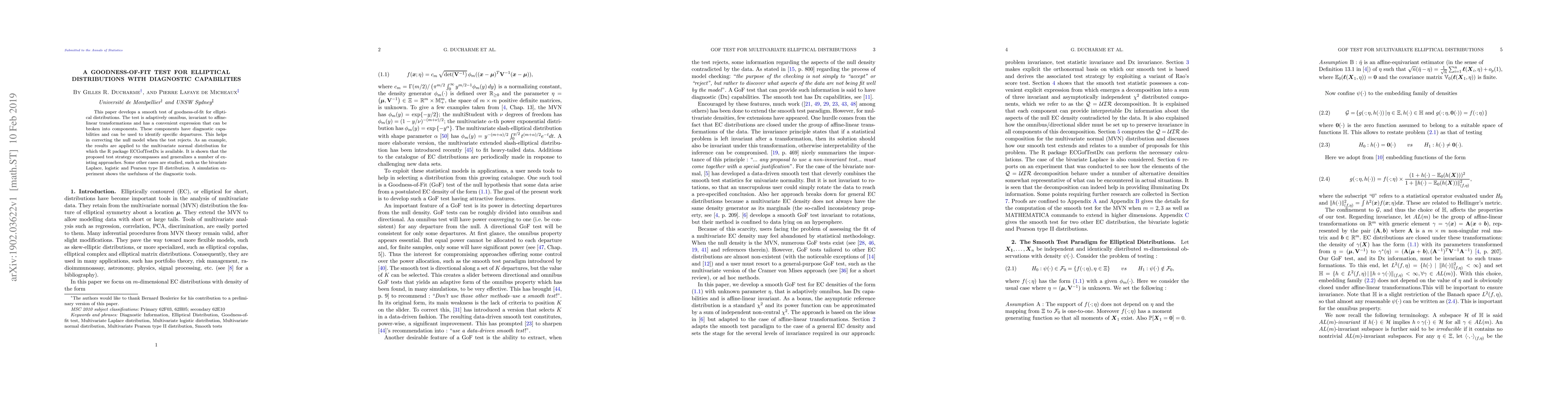 This paper introduces a smooth goodness-of-fit test for elliptical distributions, featuring adaptive, affine-invariant properties and diagnostic components to identify specific model deviations. The test is exemplified through the multivariate normal distribution and shown to generalize existing methods.