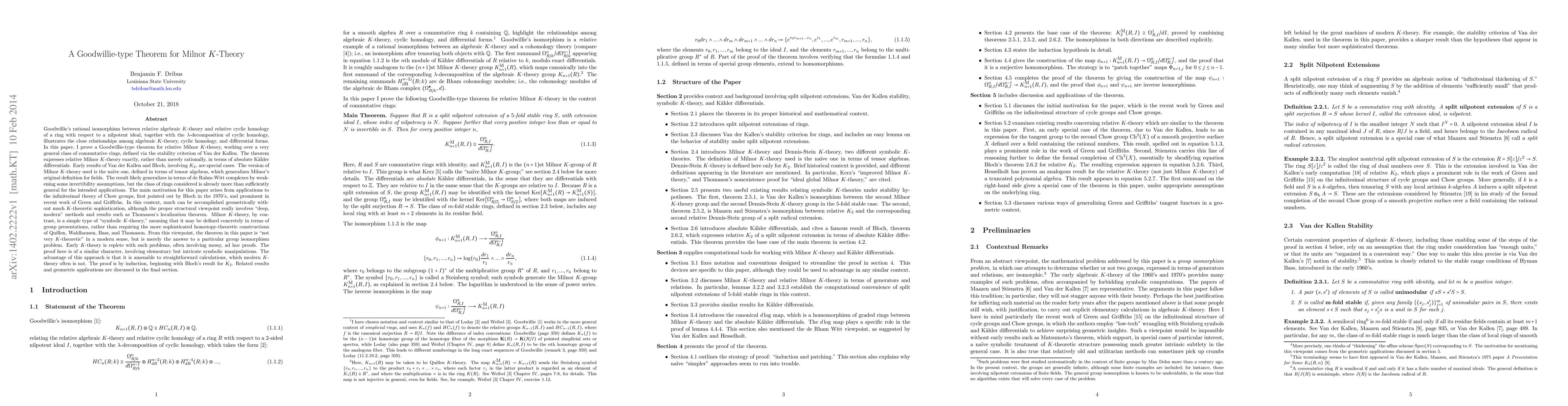 Goodwillie's rational isomorphism between relative algebraic K-theory and relative cyclic homology, together with the lambda decomposition of cyclic homology, illustrates the close relationships among algebraic K-theory, cyclic homology, and differential forms. In this paper, I prove a Goodwillie-type theorem for relative Milnor $K$-theory, working over a very general class of commutative rings, defined via the stability criterion of Van der Kallen. Early results of Van der Kallen and Bloch are special cases. The result likely generalizes in terms of de Rahm-Witt complexes, by weakening some invertibility assumptions, but the class of rings considered is already more than sufficiently general for the intended applications. The main motivation for this paper arises from applications to the infinitesimal theory of Chow groups, first pointed out by Bloch in the 1970's, and prominent in recent work of Green and Griffiths. Related results and geometric applications are discussed in the final section.