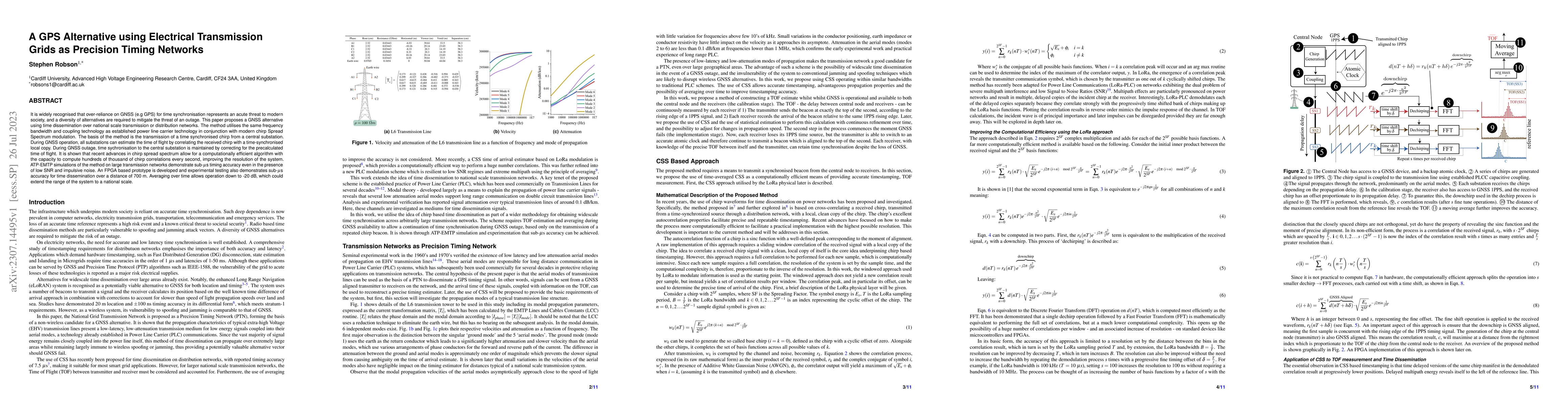 This paper proposes a GNSS alternative for time synchronisation using national electrical transmission grids, employing chirp spread spectrum modulation and time-synchronised chirp transmission from substations. Experimental results show sub-$\mu$s accuracy over 700 m, with potential for national-scale implementation through averaging techniques.