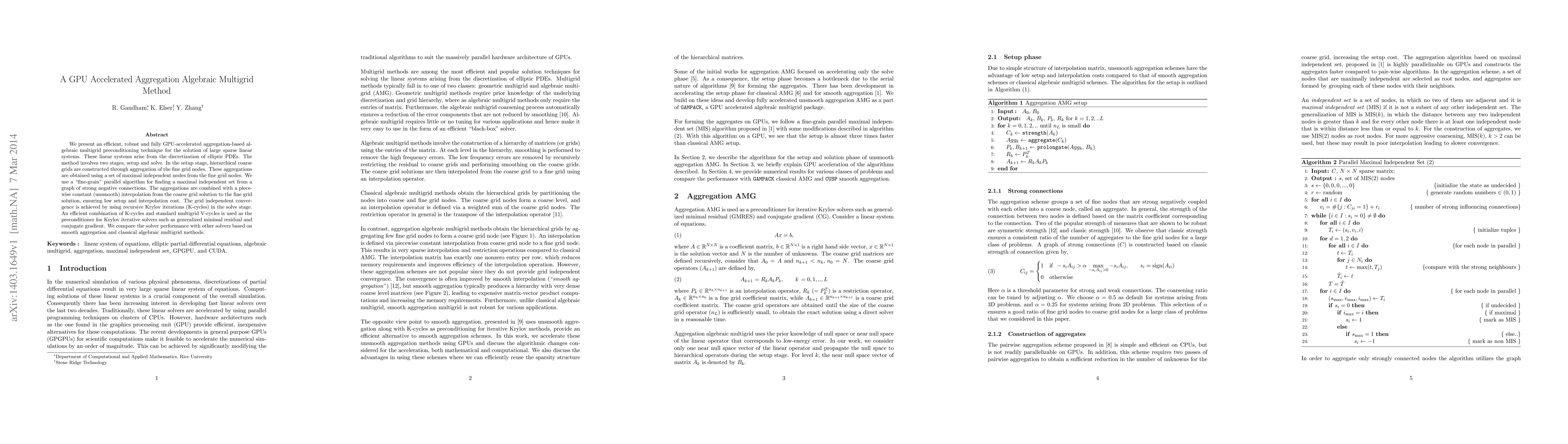 This paper introduces a GPU-accelerated aggregation-based algebraic multigrid method for solving large sparse linear systems from elliptic PDEs, featuring efficient setup and solve stages with hierarchical coarse grid construction and recursive Krylov iterations, and demonstrates superior performance compared to other methods.