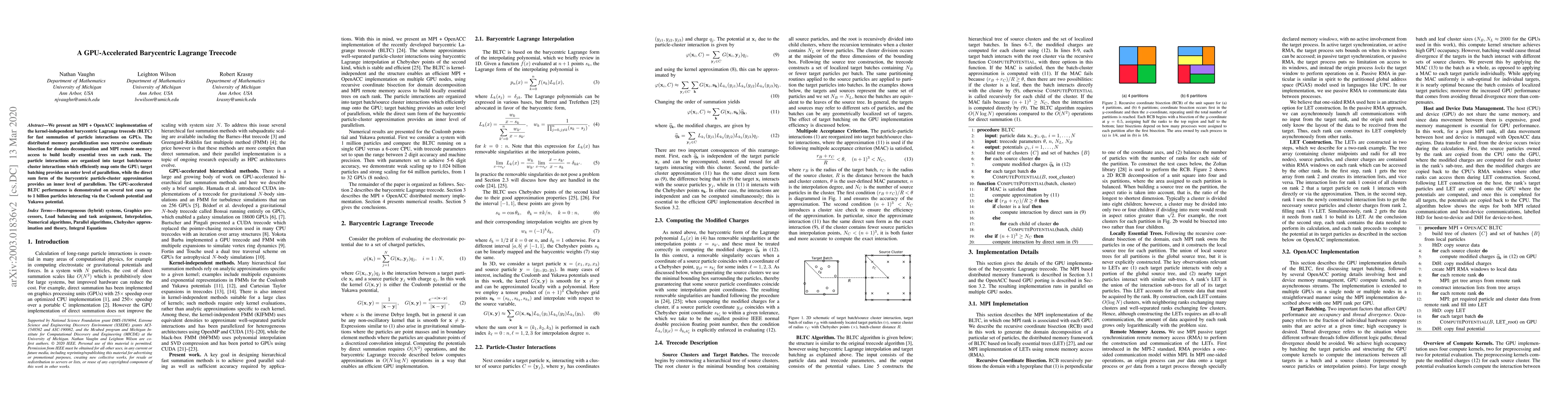 This paper introduces an MPI + OpenACC implementation of the barycentric Lagrange treecode (BLTC) for GPU-accelerated particle interaction summation. It leverages recursive coordinate bisection and MPI for parallelization, enabling efficient handling of up to 1 billion particles using both target batching and direct sum approximations.