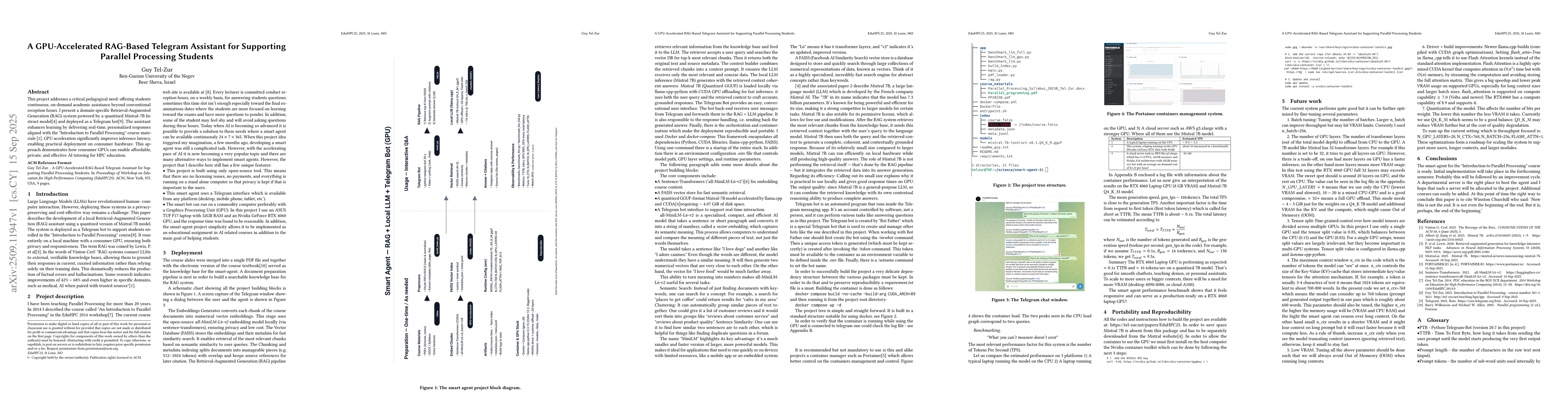 This project addresses a critical pedagogical need: offering students continuous, on-demand academic assistance beyond conventional reception hours. I present a domain-specific Retrieval-Augmented Generation (RAG) system powered by a quantized Mistral-7B Instruct model and deployed as a Telegram bot. The assistant enhances learning by delivering real-time, personalized responses aligned with the "Introduction to Parallel Processing" course materials. GPU acceleration significantly improves inference latency, enabling practical deployment on consumer hardware. This approach demonstrates how consumer GPUs can enable affordable, private, and effective AI tutoring for HPC education.