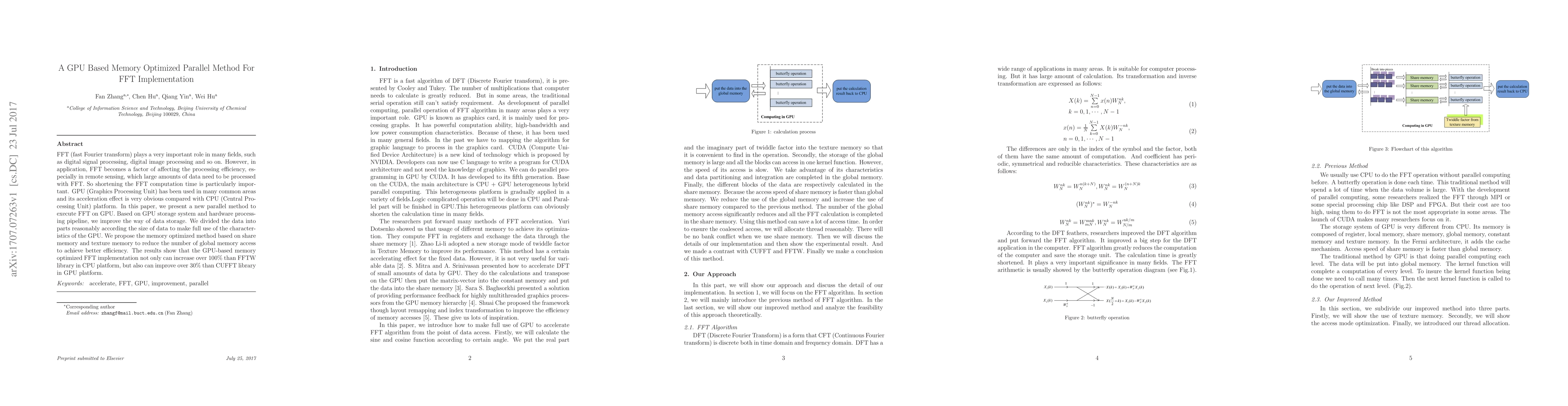 This paper introduces a GPU-based parallel method for FFT implementation optimized for memory efficiency, significantly reducing global memory access. The proposed method achieves over 100% performance improvement over CPU-based FFTW and over 30% over GPU-based CUFFT.