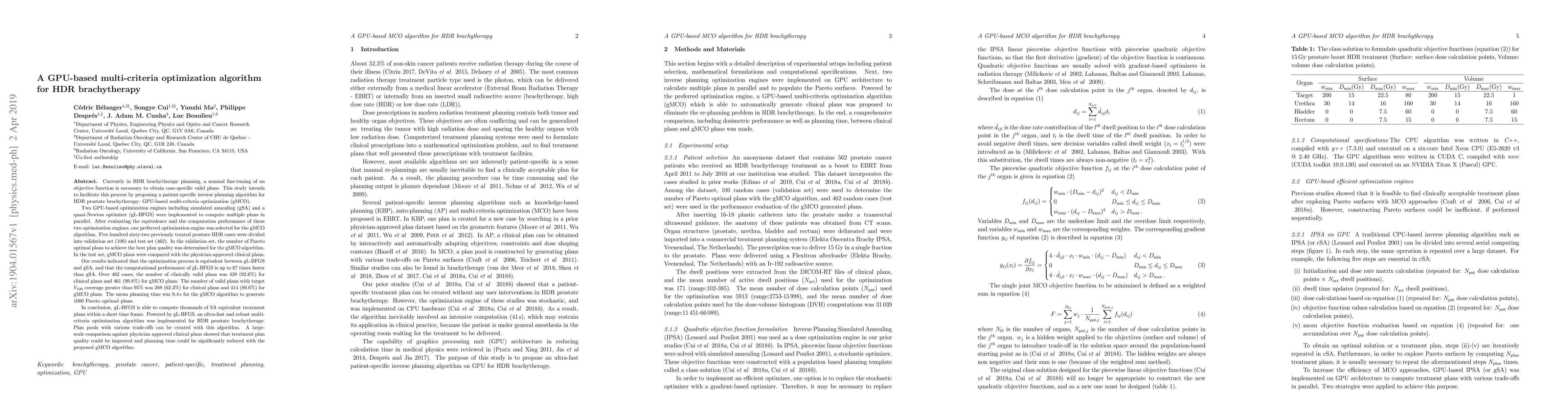 This study proposes a GPU-based multi-criteria optimization (gMCO) algorithm for HDR prostate brachytherapy, utilizing either simulated annealing or quasi-Newton optimization to generate patient-specific treatment plans. The gL-BFGS optimizer was found to be the most efficient, significantly reducing planning time and improving plan quality compared to physician-approved clinical plans.