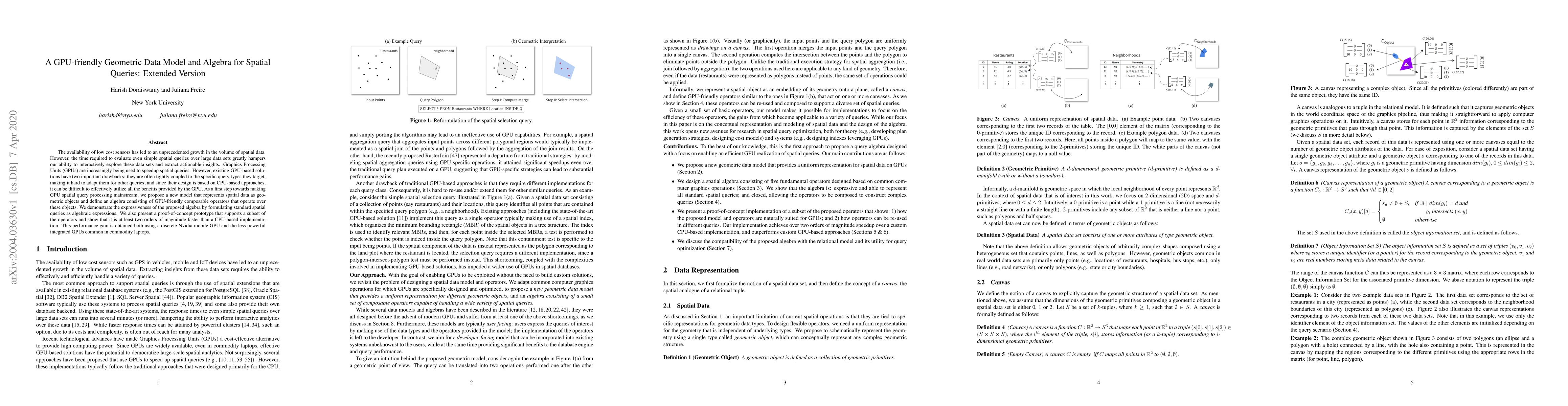 The paper proposes a new GPU-friendly geometric data model and algebra for spatial queries, addressing the limitations of existing GPU-based solutions. The model represents spatial data as geometric objects and defines composable operators, demonstrated to significantly speed up standard spatial queries, with a prototype showing at least two orders of magnitude improvement over CPU-based implementations on both high-end and integrated GPUs.