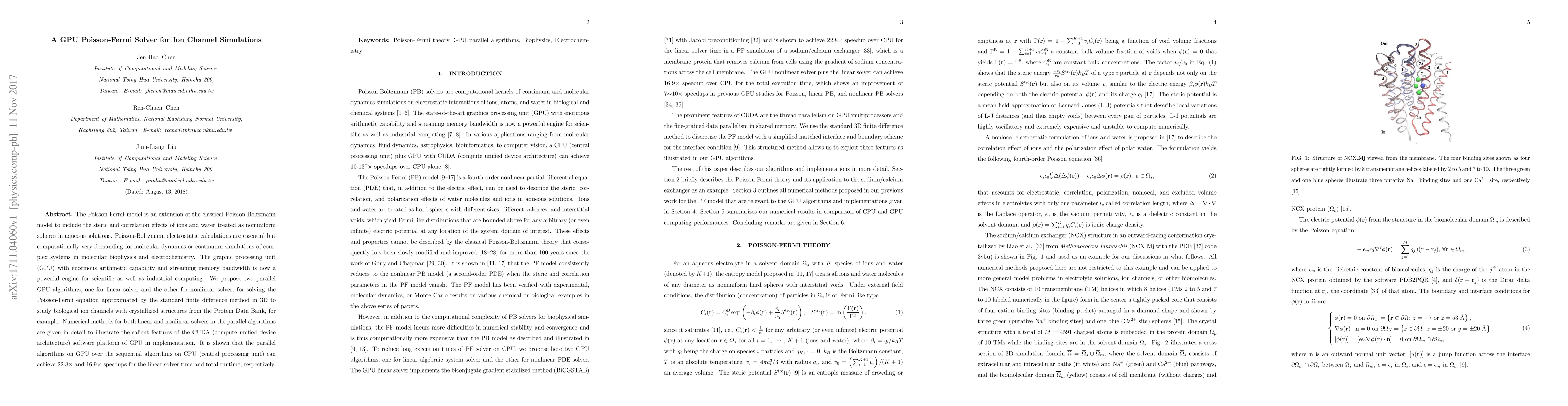 This paper proposes GPU-based parallel algorithms for solving the Poisson-Fermi equation, which models ion interactions in aqueous solutions, using CUDA. The algorithms achieve significant speedups over CPU-based methods, demonstrating 22.8x and 16.9x improvements for linear solver time and total runtime, respectively.