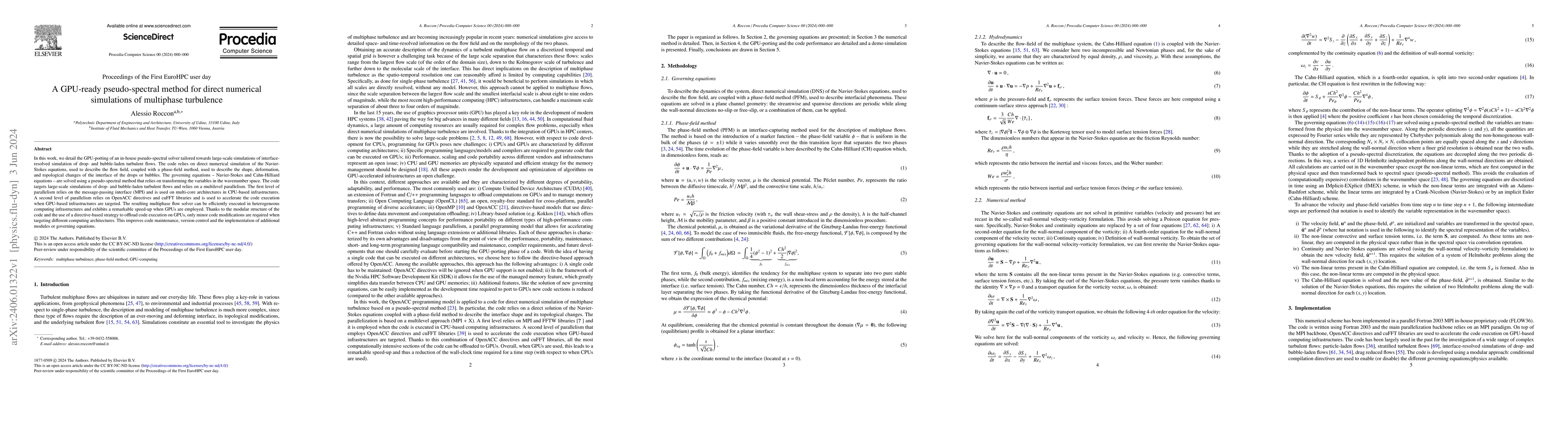 This research portably transfers a pseudo-spectral solver for simulating multiphase turbulence onto GPUs, leveraging OpenACC directives and cuFFT libraries for significant speed-ups in large-scale drop- and bubble-laden turbulent flow simulations. The code employs a modular structure and directive-based GPU offloading, facilitating ease of maintenance and flexibility for different computing architectures.
