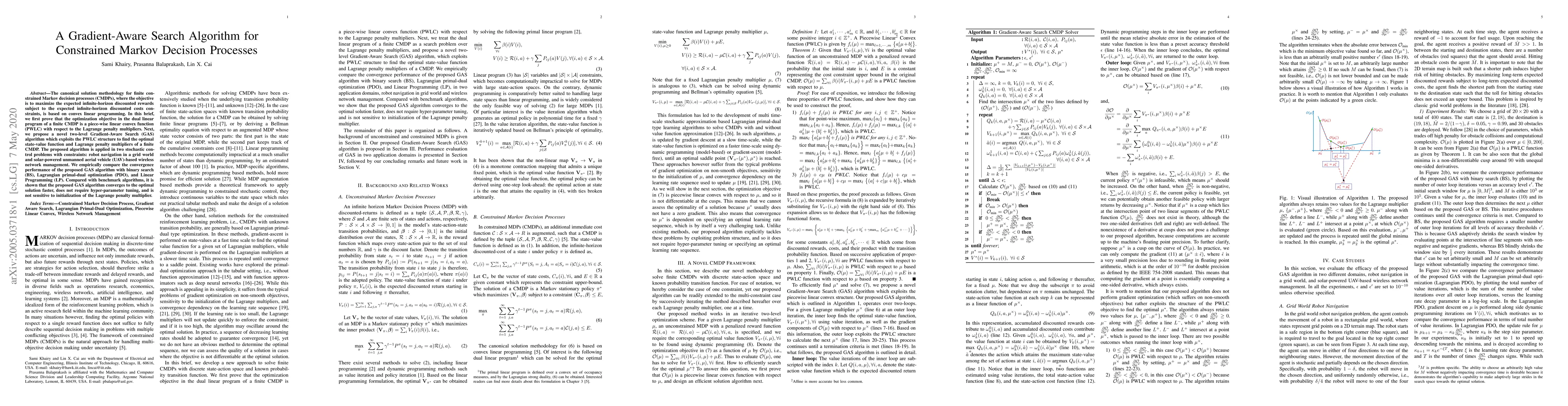A new algorithm called Gradient-Aware Search is proposed for solving constrained Markov decision processes, which converges faster than existing methods without requiring hyperparameter tuning or initialization of Lagrange penalty multipliers.