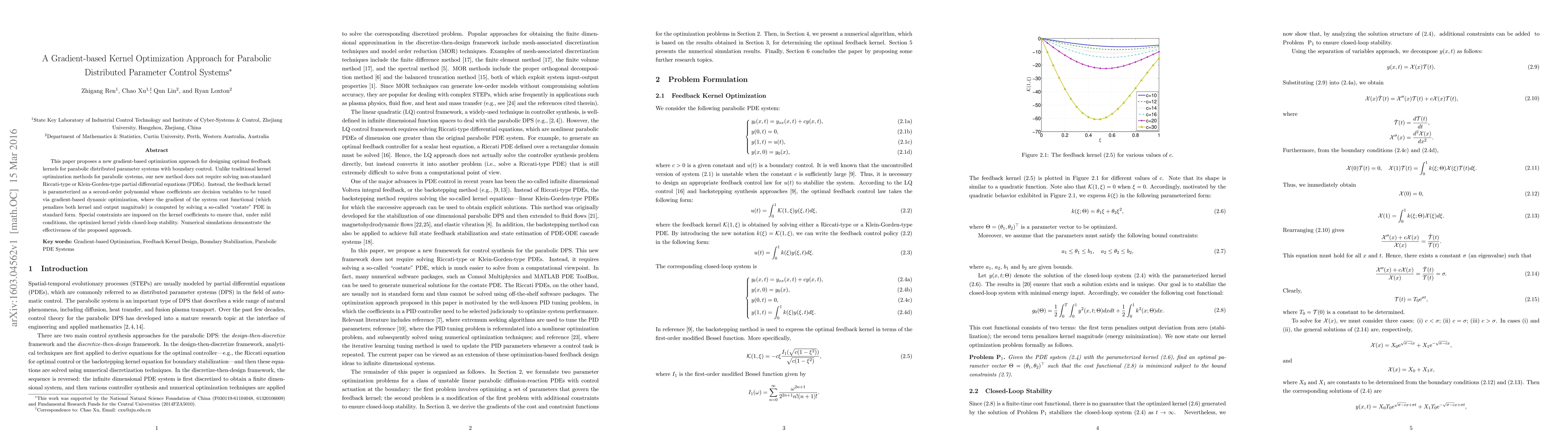 This paper proposes a gradient-based optimization method for designing optimal feedback kernels for parabolic distributed parameter systems without solving non-standard PDEs, instead using a parameterized second-order polynomial tuned via dynamic optimization. Numerical simulations show the method's effectiveness in achieving closed-loop stability.