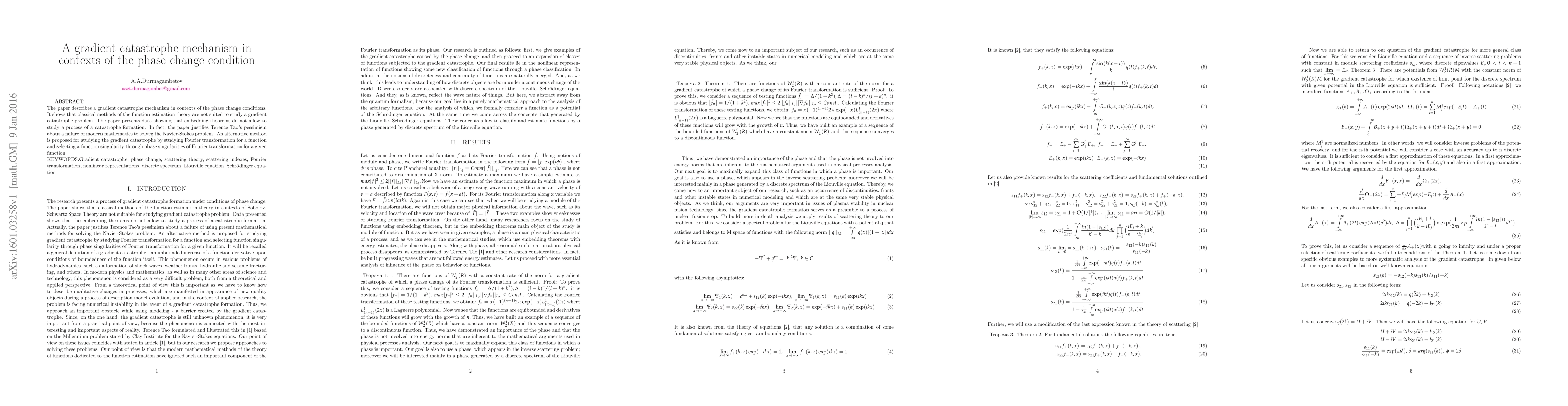 The paper describes the mechanism of occurrence of a gradient catastrophe when changing phase. Materials shows that classical methods of estimation theory of functions do not fit the problem of studying the gradient catastrophe. We present material showing that the embedding theorem can not give an opportunity to study the process of a gradient catastrophe. In fact, work justifies pessimism Terence Tao in the insolvency of modern mathematics to solve the problem of the Navier-Stokes equations. It is suggested an alternative method for studying the gradient catastrophe through the study of the Fourier transform function through special properties phases of the Fourier transform of this function