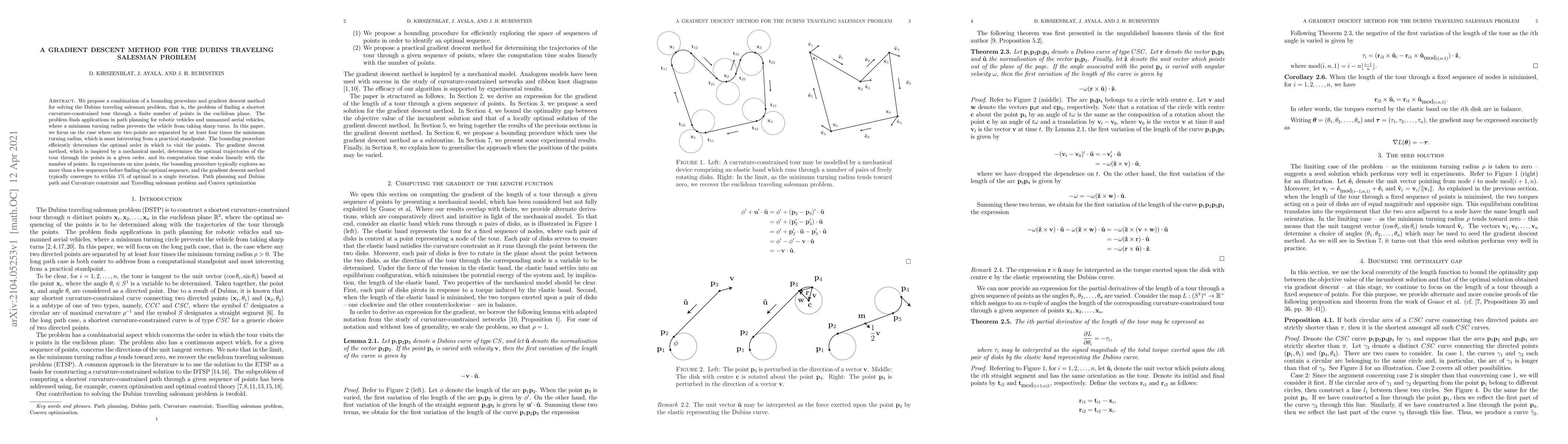 We propose a combination of a bounding procedure and gradient descent method for solving the Dubins traveling salesman problem, that is, the problem of finding a shortest curvature-constrained tour through a finite number of points in the euclidean plane. The problem finds applications in path planning for robotic vehicles and unmanned aerial vehicles, where a minimum turning radius prevents the vehicle from taking sharp turns. In this paper, we focus on the case where any two points are separated by at least four times the minimum turning radius, which is most interesting from a practical standpoint. The bounding procedure efficiently determines the optimal order in which to visit the points. The gradient descent method, which is inspired by a mechanical model, determines the optimal trajectories of the tour through the points in a given order, and its computation time scales linearly with the number of points. In experiments on nine points, the bounding procedure typically explores no more than a few sequences before finding the optimal sequence, and the gradient descent method typically converges to within 1\% of optimal in a single iteration.