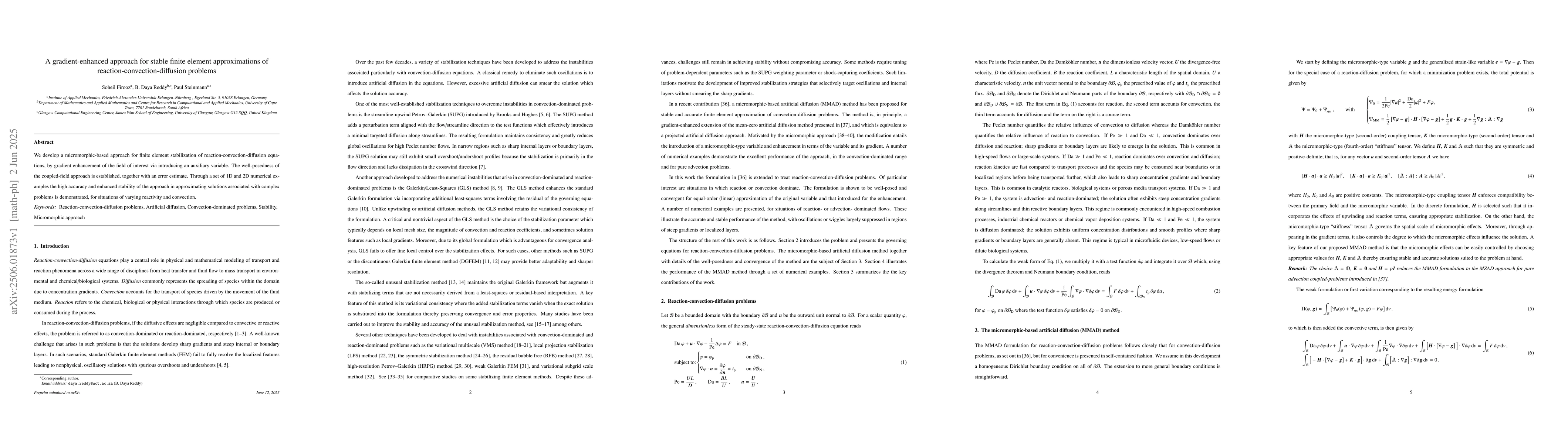 The research develops a micromorphic-based approach for finite element stabilization of reaction-convection-diffusion equations by introducing an auxiliary variable to enhance the gradient of the field of interest.