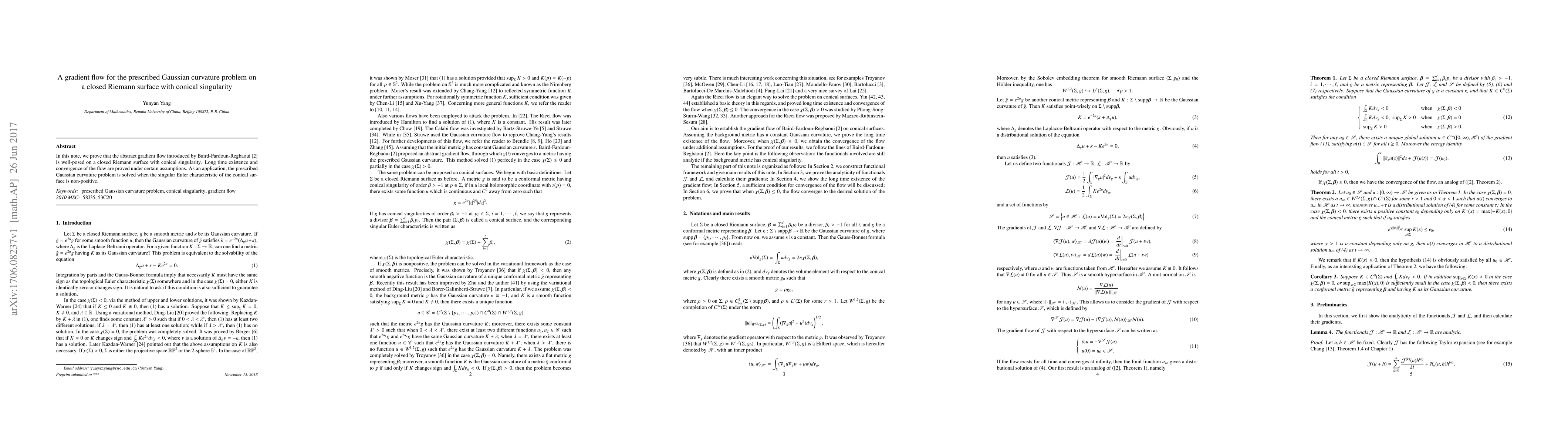 In this note, we prove that the abstract gradient flow introduced by Baird-Fardoun-Regbaoui \cite{BFR}is well-posed on a closed Riemann surface with conical singularity. Long time existence and convergence of the flow are proved under certain assumptions. As an application, the prescribed Gaussian curvature problem is solved when the singular Euler characteristic of the conical surface is non-positive.