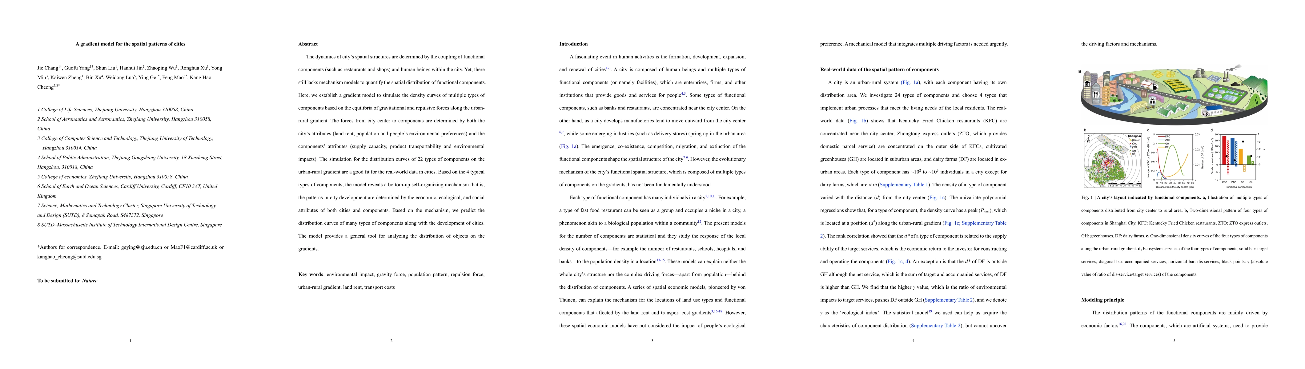 The dynamics of city's spatial structures are determined by the coupling of functional components (such as restaurants and shops) and human beings within the city. Yet, there still lacks mechanism models to quantify the spatial distribution of functional components. Here, we establish a gradient model to simulate the density curves of multiple types of components based on the equilibria of gravitational and repulsive forces along the urban-rural gradient. The forces from city center to components are determined by both the city's attributes (land rent, population and people's environmental preferences) and the components attributes (supply capacity, product transportability and environmental impacts). The simulation for the distribution curves of 22 types of components on the urban-rural gradient are a good fit for the real-world data in cities. Based on the 4 typical types of components, the model reveals a bottom-up self-organizing mechanism that is, the patterns in city development are determined by the economic, ecological, and social attributes of both cities and components. Based on the mechanism, we predict the distribution curves of many types of components along with the development of cities. The model provides a general tool for analyzing the distribution of objects on the gradients.