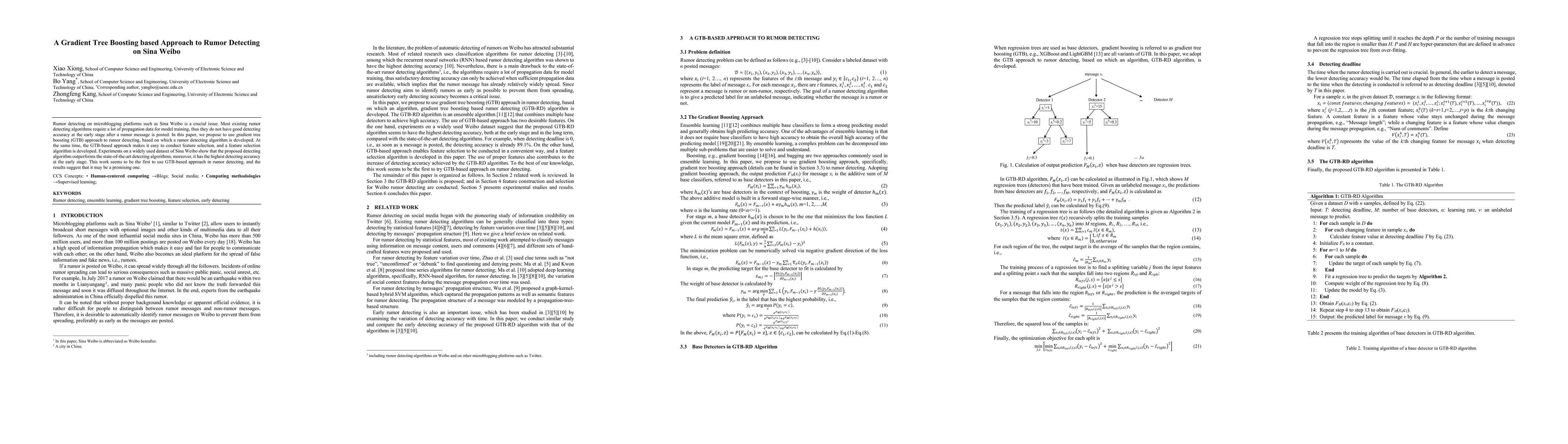 This paper proposes a gradient tree boosting (GTB) approach for early rumor detection on Sina Weibo, addressing the limitation of existing algorithms that require extensive propagation data. The developed GTB-based rumor detecting algorithm, along with an accompanying feature selection method, demonstrates superior early detection accuracy compared to state-of-the-art methods.