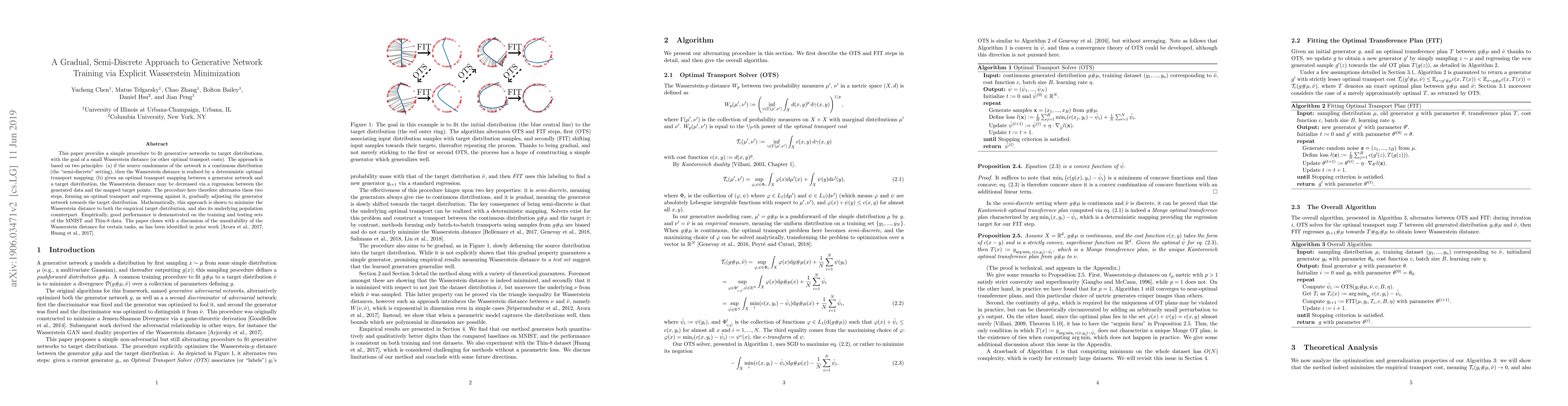This paper provides a simple procedure to fit generative networks to target distributions, with the goal of a small Wasserstein distance (or other optimal transport costs). The approach is based on two principles: (a) if the source randomness of the network is a continuous distribution (the "semi-discrete" setting), then the Wasserstein distance is realized by a deterministic optimal transport mapping; (b) given an optimal transport mapping between a generator network and a target distribution, the Wasserstein distance may be decreased via a regression between the generated data and the mapped target points. The procedure here therefore alternates these two steps, forming an optimal transport and regressing against it, gradually adjusting the generator network towards the target distribution. Mathematically, this approach is shown to minimize the Wasserstein distance to both the empirical target distribution, and also its underlying population counterpart. Empirically, good performance is demonstrated on the training and testing sets of the MNIST and Thin-8 data. The paper closes with a discussion of the unsuitability of the Wasserstein distance for certain tasks, as has been identified in prior work [Arora et al., 2017, Huang et al., 2017].