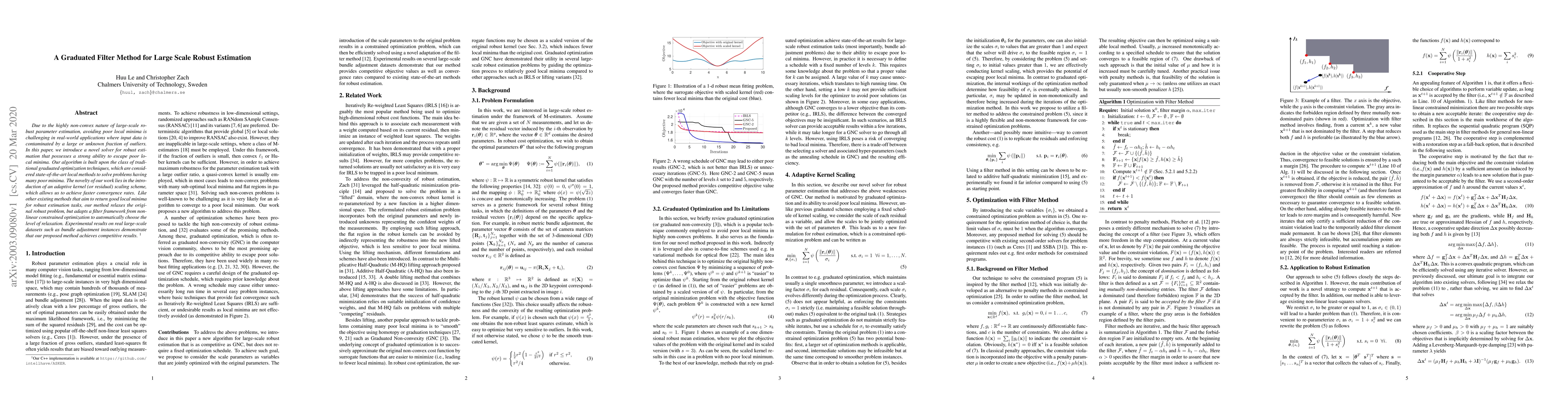 This paper proposes a novel graduated filter method for large-scale robust estimation, featuring an adaptive kernel scaling scheme to escape poor local minima and achieve faster convergence. The method adapts a filter framework from non-linear constrained optimization to automatically determine the level of relaxation, demonstrating competitive results on real datasets.