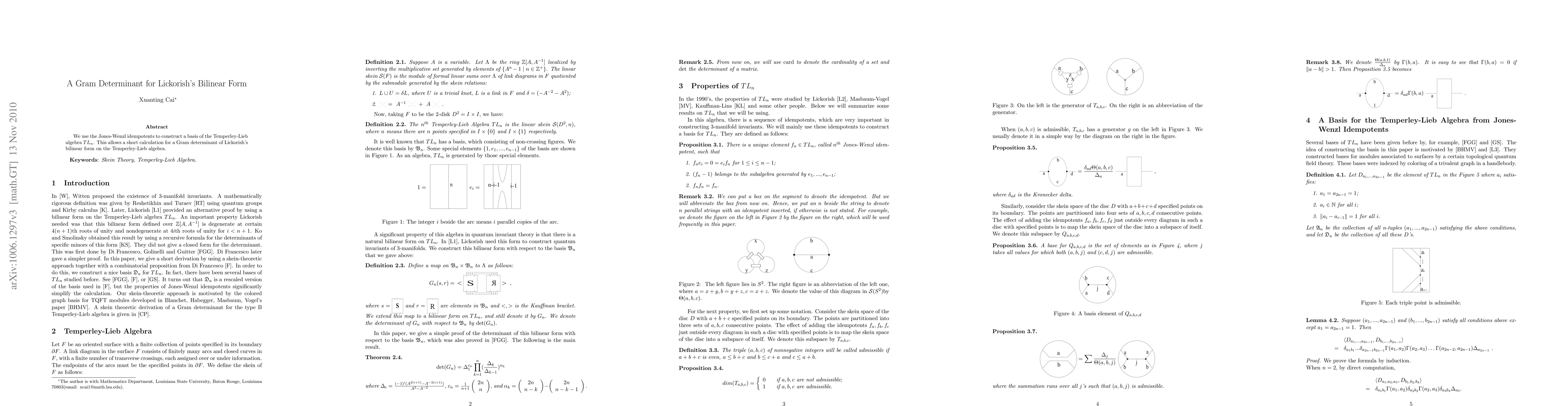 This paper constructs a basis for the Temperley-Lieb algebra TL_n using Jones-Wenzl idempotents, enabling a straightforward calculation of the Gram determinant for Lickorish's bilinear form on TL_n.