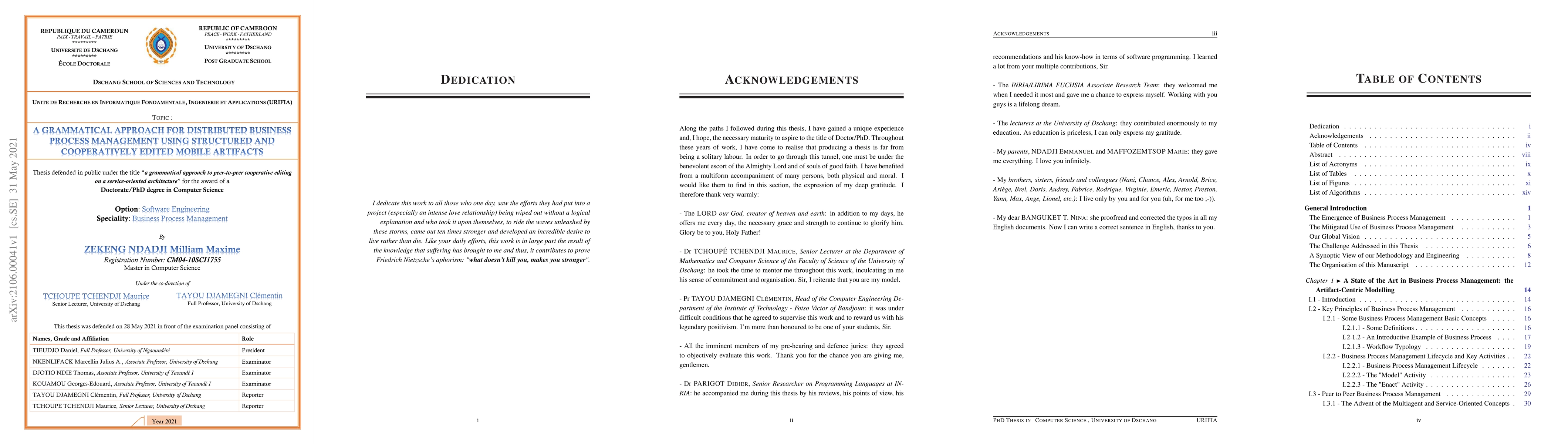 In this thesis, we focus on the proposal of distributed workflow systems dedicated to the automation of administrative business processes. We propose an approach to build such systems by relying on the concepts of multiagent systems, Peer to Peer (P2P) architecture, Service-Oriented Architecture (SOA) and structured documents (artifacts) cooperative edition. Indeed, we develop mathematical tools that allow any workflow systems designer, to express each administrative process in the form of an attributed grammar whose symbols represent tasks to be executed, productions specify a scheduling of these tasks, and instances (the derivation trees that conform to it) represent the different execution scenarios leading to business goal states. The obtained grammatical model is then introduced into a proposed P2P system which is in charge of carrying out the completely decentralised execution of the underlying process's instances. The said system orchestrates a process's instance execution as a choreography during which, various software agents driven by human agents (actors), coordinate themselves through artifacts that they collectively edit. The exchanged artifacts represent the system's memory: they provide information on already executed tasks, on those ready to be executed and on their executors. The software agents are autonomous and identical: they execute the same unique protocol each time they receive an artifact. This protocol allows them to identify the tasks they must immediately execute, to execute them, to update the artifact and to disseminate it if necessary, for the continuation of the execution. Moreover, actors potentially have only a partial perception of processes in which they are involved. In practice, this means that certain tasks can be carried out confidentially.