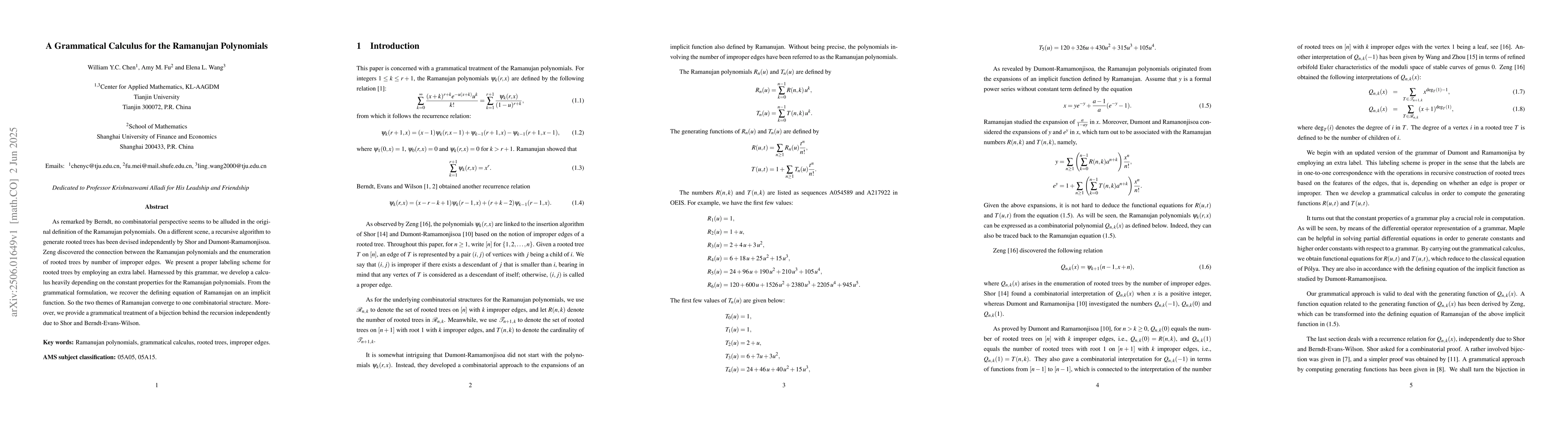 This work is novel as it combines Ramanujan polynomial theory with combinatorial tree enumeration, presenting a grammatical calculus that recovers Ramanujan's defining equation and provides a unified perspective on related themes.