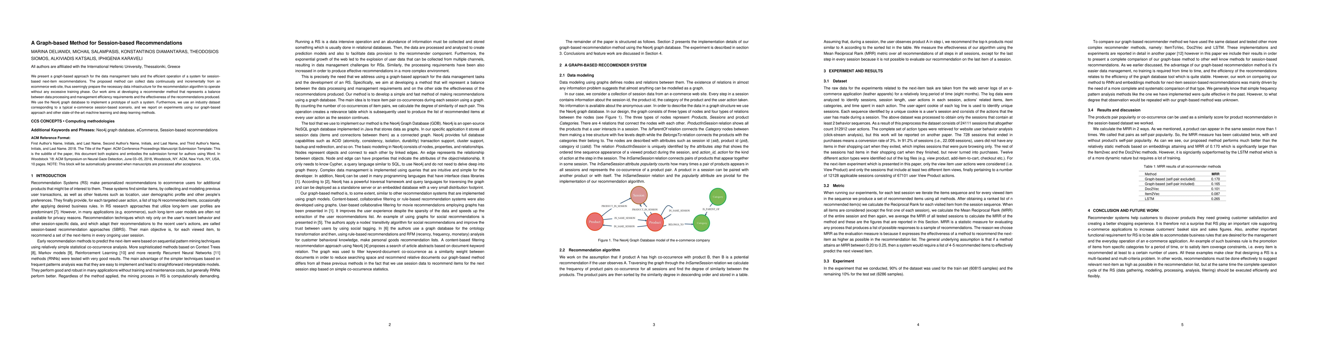 We present a graph-based approach for the data management tasks and the efficient operation of a system for session-based next-item recommendations. The proposed method can collect data continuously and incrementally from an ecommerce web site, thus seemingly prepare the necessary data infrastructure for the recommendation algorithm to operate without any excessive training phase. Our work aims at developing a recommender method that represents a balance between data processing and management efficiency requirements and the effectiveness of the recommendations produced. We use the Neo4j graph database to implement a prototype of such a system. Furthermore, we use an industry dataset corresponding to a typical e-commerce session-based scenario, and we report on experiments using our graph-based approach and other state-of-the-art machine learning and deep learning methods.