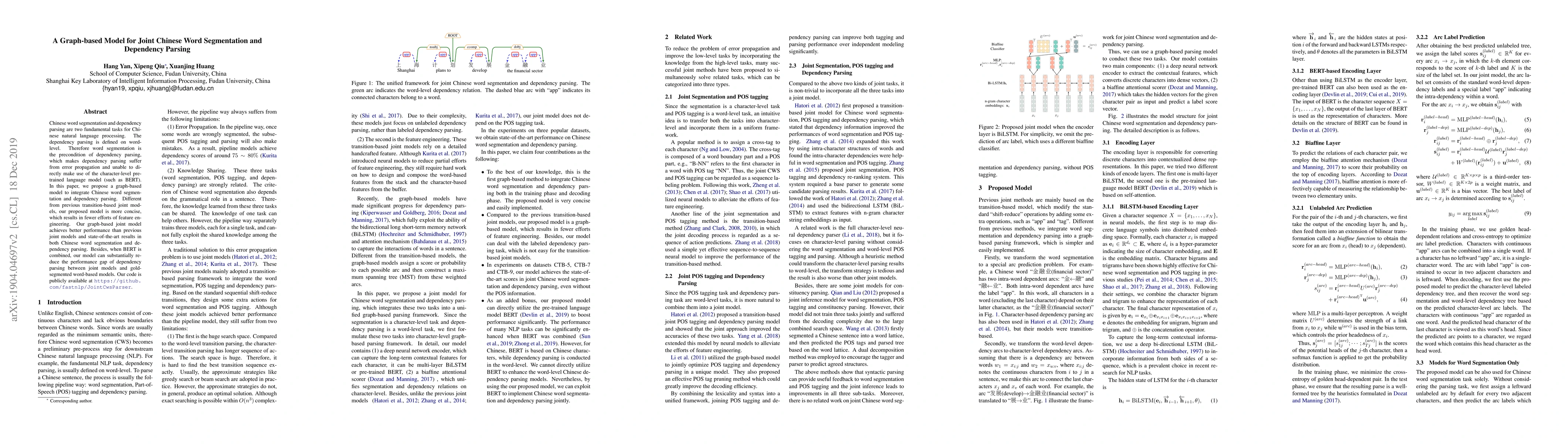 This paper proposes a graph-based model to jointly perform Chinese word segmentation and dependency parsing, achieving better results than previous joint and standalone models. The model reduces error propagation and enhances the integration of character-level language models like BERT.