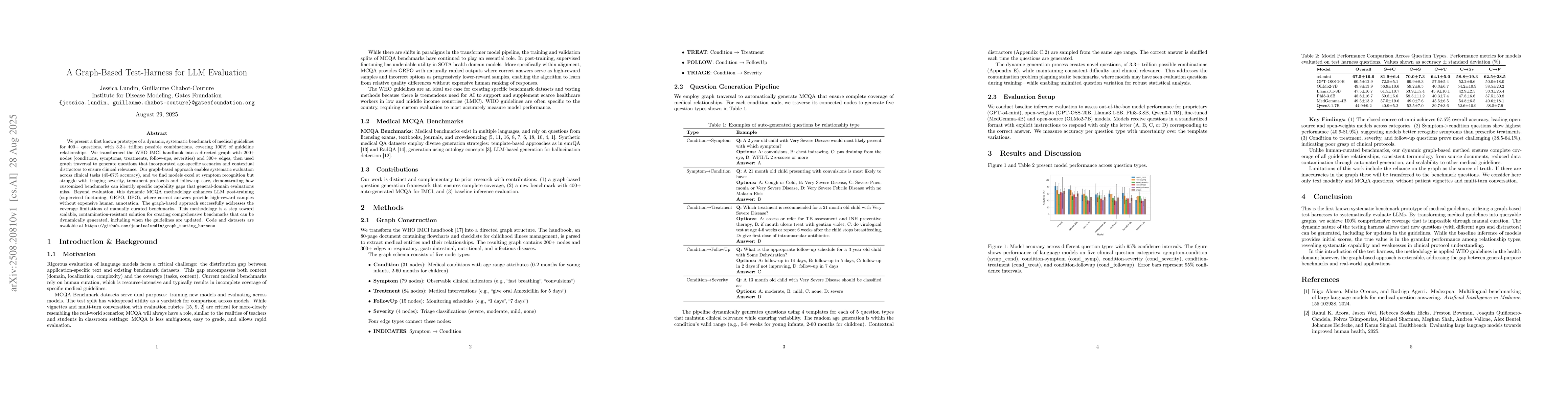 We present a first known prototype of a dynamic, systematic benchmark of medical guidelines for 400+ questions, with 3.3+ trillion possible combinations, covering 100\% of guideline relationships. We transformed the WHO IMCI handbook into a directed graph with 200+ nodes (conditions, symptoms, treatments, follow-ups, severities) and 300+ edges, then used graph traversal to generate questions that incorporated age-specific scenarios and contextual distractors to ensure clinical relevance. Our graph-based approach enables systematic evaluation across clinical tasks (45-67\% accuracy), and we find models excel at symptom recognition but struggle with triaging severity, treatment protocols and follow-up care, demonstrating how customized benchmarks can identify specific capability gaps that general-domain evaluations miss. Beyond evaluation, this dynamic MCQA methodology enhances LLM post-training (supervised finetuning, GRPO, DPO), where correct answers provide high-reward samples without expensive human annotation. The graph-based approach successfully addresses the coverage limitations of manually curated benchmarks. This methodology is a step toward scalable, contamination-resistant solution for creating comprehensive benchmarks that can be dynamically generated, including when the guidelines are updated. Code and datasets are available at https://github.com/jessicalundin/graph_testing_harness