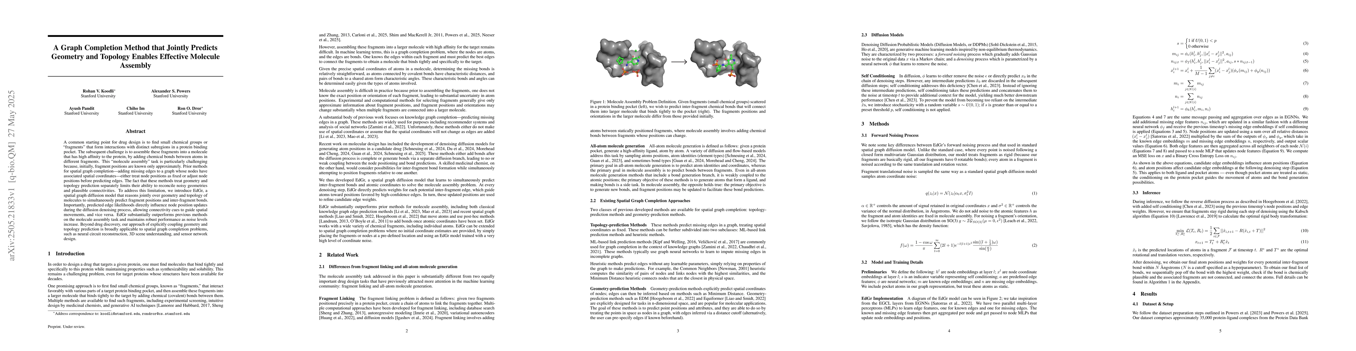 This approach of explicitly coupling geometry and topology prediction is broadly applicable to spatial graph completion problems, such as neural circuit reconstruction, 3D scene understanding, and sensor network design, beyond drug discovery.