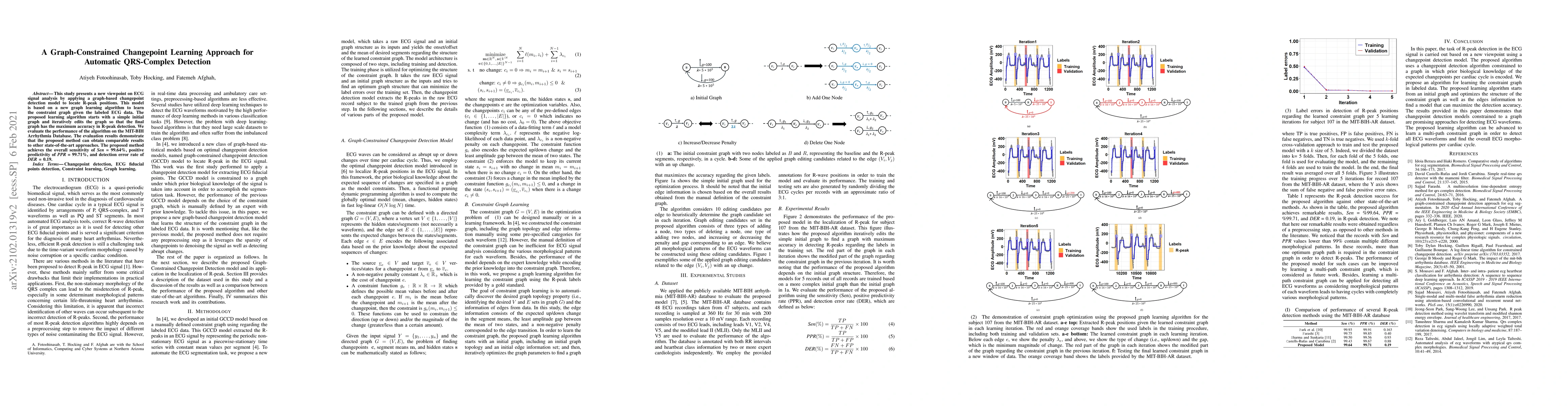 This study introduces a graph-constrained changepoint detection model for automatic QRS-complex detection in ECG signals, achieving high sensitivity, positive predictivity, and low detection error rate. The method iteratively refines a graph learning algorithm based on labeled ECG data to optimize R-peak detection accuracy.