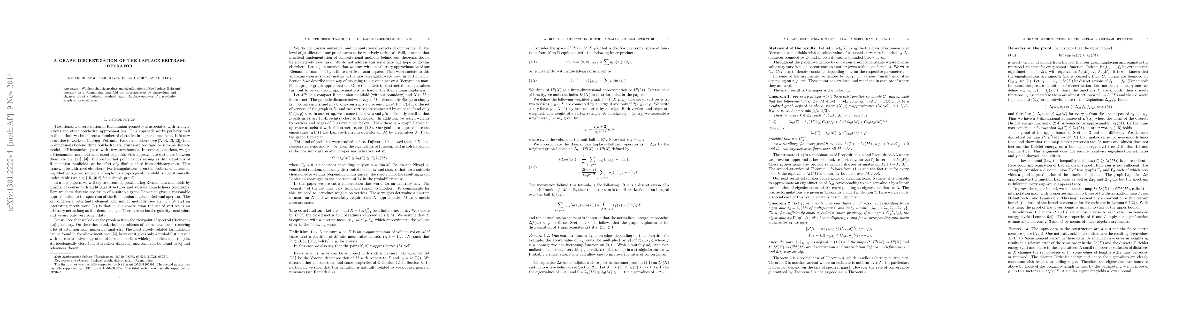 This paper demonstrates that the eigenvalues and eigenfunctions of the Laplace-Beltrami operator on a Riemannian manifold can be approximated by those of a graph Laplacian derived from a proximity graph on an epsilon-net. This provides a method for discretizing continuous differential operators on manifolds.