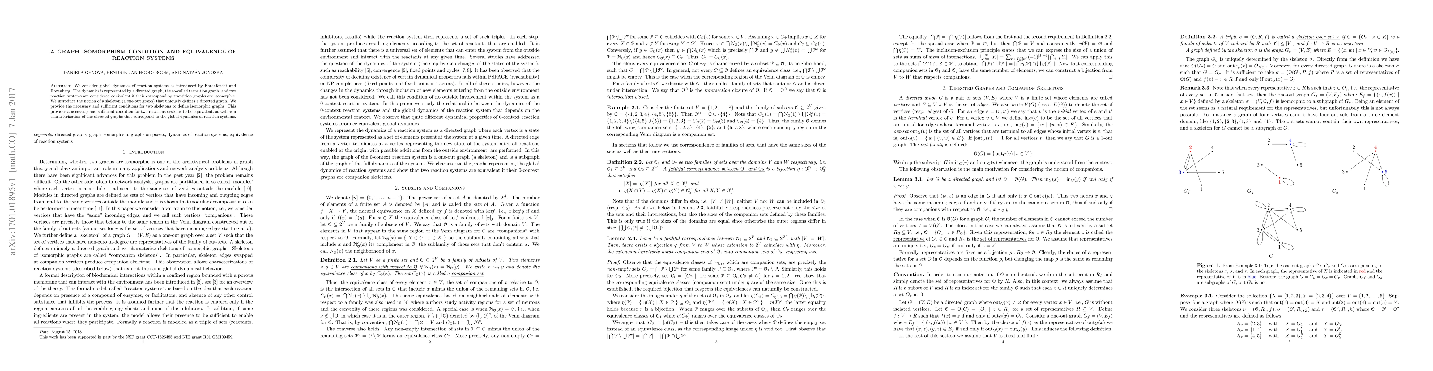 We consider global dynamics of reaction systems as introduced by Ehrenfeucht and Rozenberg. The dynamics is represented by a directed graph, the so-called transition graph, and two reaction systems are considered equivalent if their corresponding transition graphs are isomorphic. We introduce the notion of a skeleton (a one-out graph) that uniquely defines a directed graph. We provide the necessary and sufficient conditions for two skeletons to define isomorphic graphs. This provides a necessary and sufficient condition for two reactions systems to be equivalent, as well as a characterization of the directed graphs that correspond to the global dynamics of reaction systems.