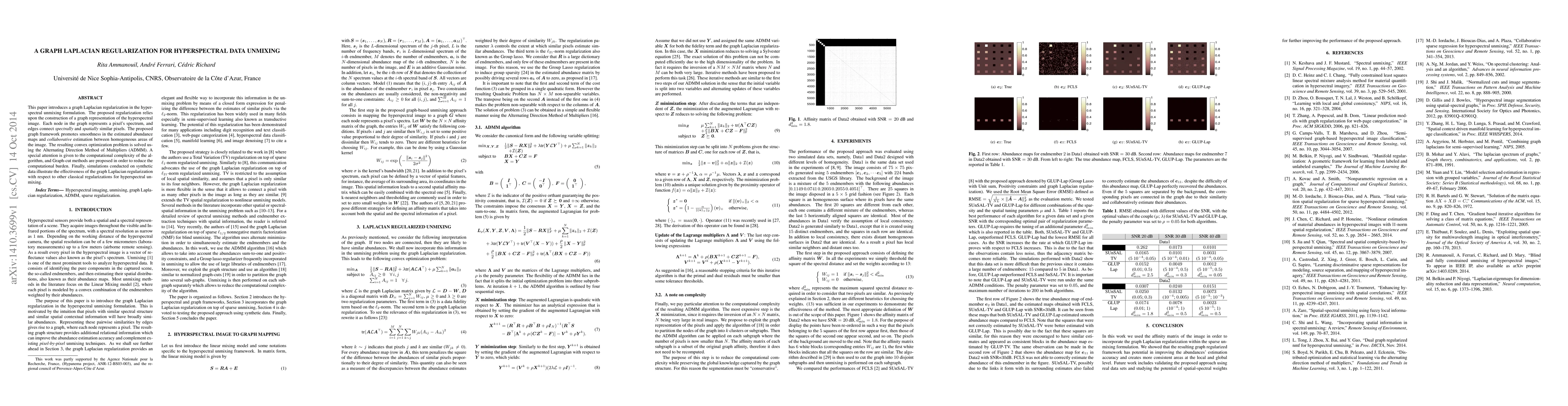 This paper proposes a graph Laplacian regularization method for hyperspectral unmixing, constructing a graph where nodes represent pixel spectra and edges connect similar pixels to promote smoothness in abundance maps. The optimization problem is solved using ADMM, with graph-cut methods reducing computational complexity, and simulations show its effectiveness over classical methods.