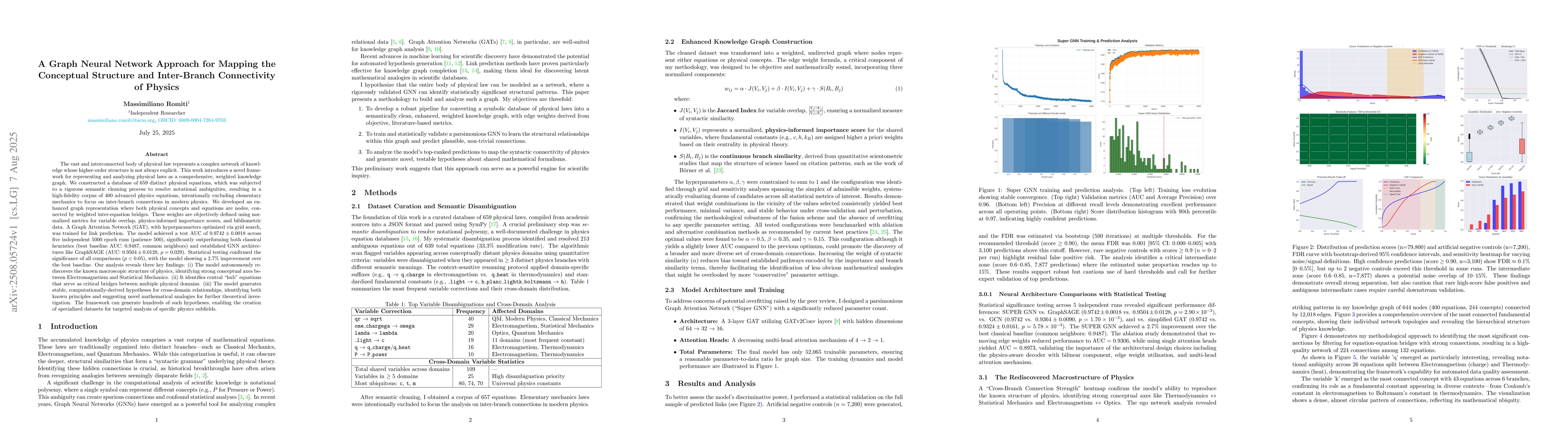 This work introduces a novel framework for representing and analyzing physical laws as a weighted knowledge graph. We constructed a database of 659 distinct physical equations, subjected to rigorous semantic cleaning to resolve notational ambiguities, resulting in a corpus of 400 advanced physics equations. We developed an enhanced graph representation where both physical concepts and equations are nodes, connected by weighted inter-equation bridges. These weights are objectively defined using normalized metrics for variable overlap, physics-informed importance scores, and bibliometric data. A Graph Attention Network (GAT) was trained for link prediction, achieving a test AUC of 0.9742 +/- 0.0018 across five independent runs, significantly outperforming both classical heuristics (best baseline AUC: 0.9487) and established GNN architectures like GraphSAGE (AUC: 0.9504, p = 0.029). Statistical testing confirmed significance of all comparisons (p < 0.05), with 2.7% improvement over the best baseline. Our analysis reveals three key findings: (i) The model autonomously rediscovers the known macroscopic structure of physics, identifying strong conceptual axes between Electromagnetism and Statistical Mechanics. (ii) It identifies central hub equations that serve as critical bridges between multiple physical domains. (iii) The model generates stable, computationally-derived hypotheses for cross-domain relationships, identifying both known principles and suggesting novel mathematical analogies for further theoretical investigation. The framework can generate hundreds of such hypotheses, enabling the creation of specialized datasets for targeted analysis of specific physics subfields. Code and data available at https://github.com/kingelanci/graphysics
