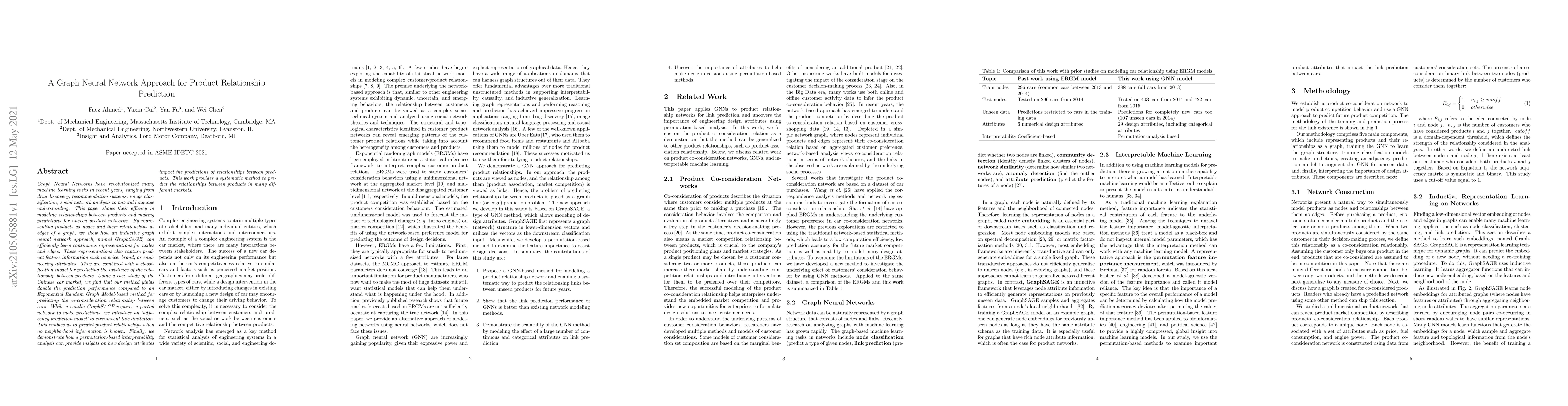 Graph Neural Networks have revolutionized many machine learning tasks in recent years, ranging from drug discovery, recommendation systems, image classification, social network analysis to natural language understanding. This paper shows their efficacy in modeling relationships between products and making predictions for unseen product networks. By representing products as nodes and their relationships as edges of a graph, we show how an inductive graph neural network approach, named GraphSAGE, can efficiently learn continuous representations for nodes and edges. These representations also capture product feature information such as price, brand, or engineering attributes. They are combined with a classification model for predicting the existence of the relationship between products. Using a case study of the Chinese car market, we find that our method yields double the prediction performance compared to an Exponential Random Graph Model-based method for predicting the co-consideration relationship between cars. While a vanilla GraphSAGE requires a partial network to make predictions, we introduce an `adjacency prediction model' to circumvent this limitation. This enables us to predict product relationships when no neighborhood information is known. Finally, we demonstrate how a permutation-based interpretability analysis can provide insights on how design attributes impact the predictions of relationships between products. This work provides a systematic method to predict the relationships between products in many different markets.