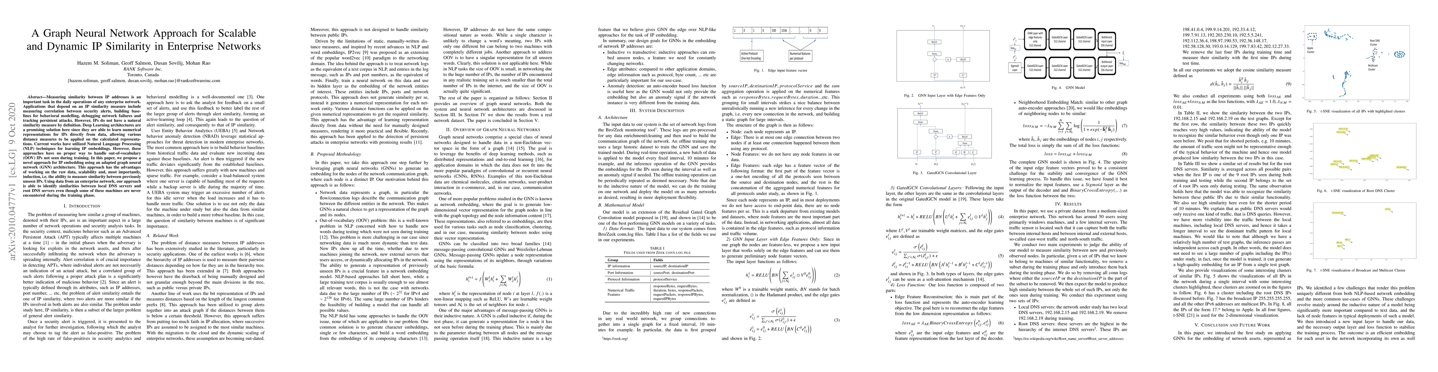 This paper proposes a graph neural network (GNN) approach for embedding IP addresses to measure similarity in enterprise networks, addressing the challenge of out-of-vocabulary IPs. The method demonstrates scalability and the ability to infer similarity for unseen IPs, enhancing applications like security alert correlation and network debugging.